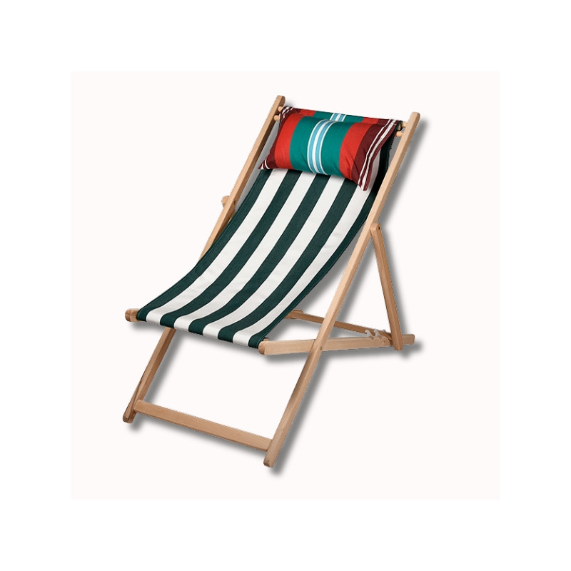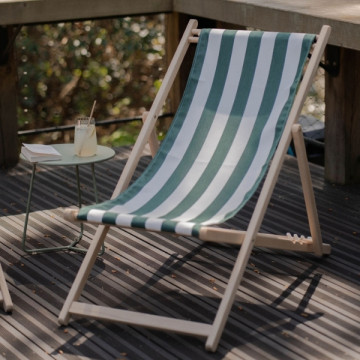 Chilienne outdoor complète avec toile Lignes Vert et coussin paresseux Lacanau. Structure en bois de hêtre naturel et toile 100 % acrylique teintée dans la masse, résistante aux UV, aux taches et aux intempéries.