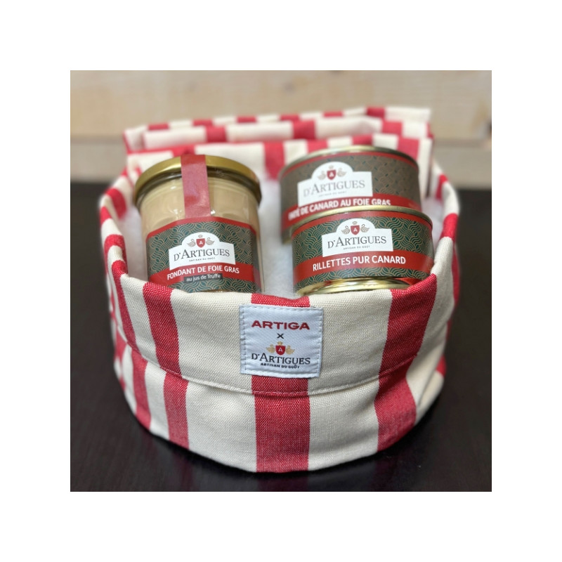 L’ensemble est présenté dans une corbeille élégante, réutilisable comme vide-poche ou panier à pain, pour prolonger l’expérience Artiga au quotidien.