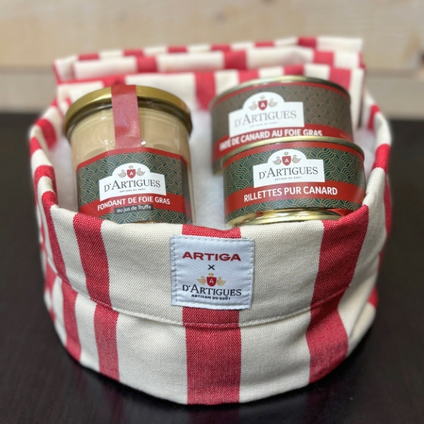 Conçu pour célébrer la convivialité et le plaisir de la table, ce coffret met à l’honneur deux savoir-faire français : les toiles rayées Artiga, fabriquées à Magescq, et les recettes fines de la Maison D’Artigues, élaborées dans le respect des traditions culinaires régionales.