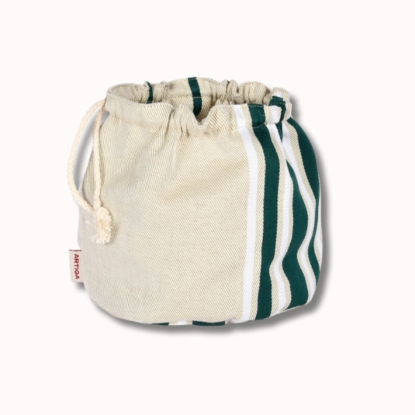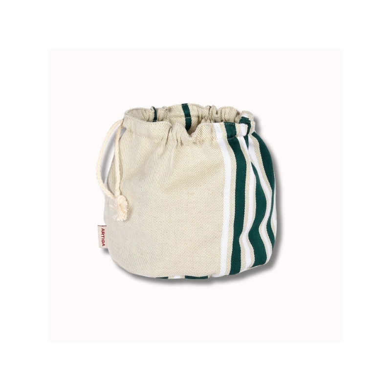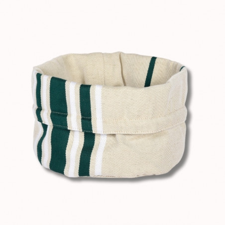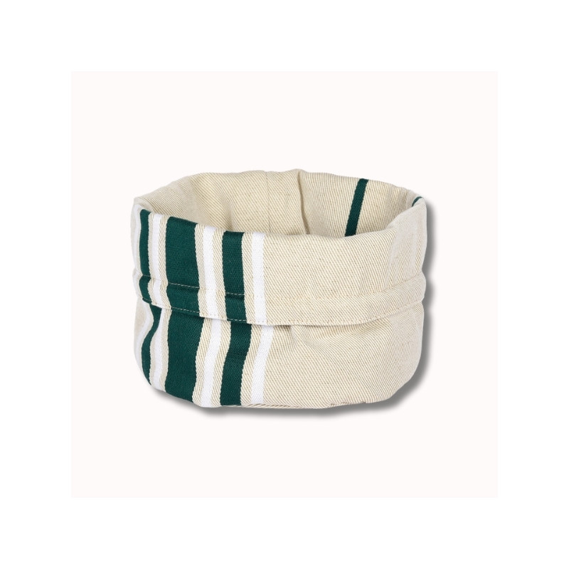 Grâce à son cordon de serrage, cette corbeille permet de fermer le pain et les viennoiseries afin de limiter leur dessèchement et de préserver leur fraîcheur plus longtemps. Pratique et astucieuse, elle peut également être retournée pour une présentation élégante à table, laissant apparaître les rayures emblématiques vert bouteille et blanc, sobres et raffinées.