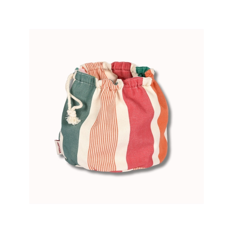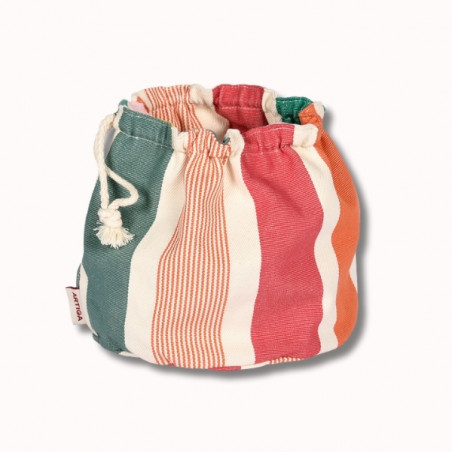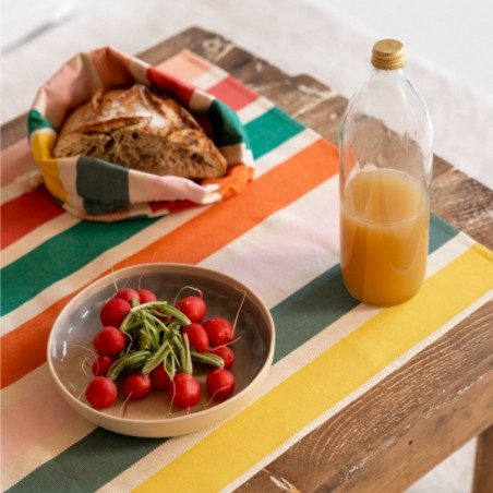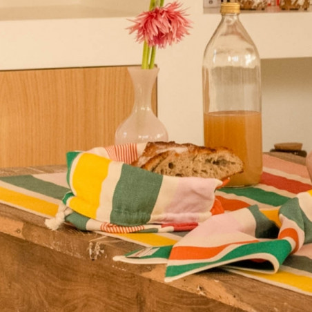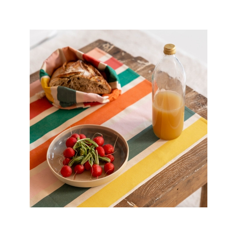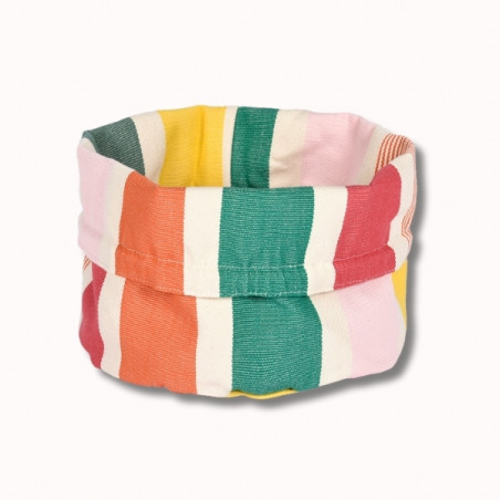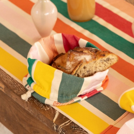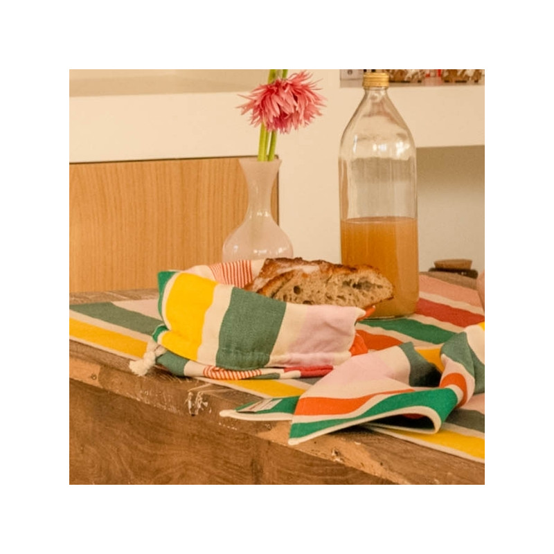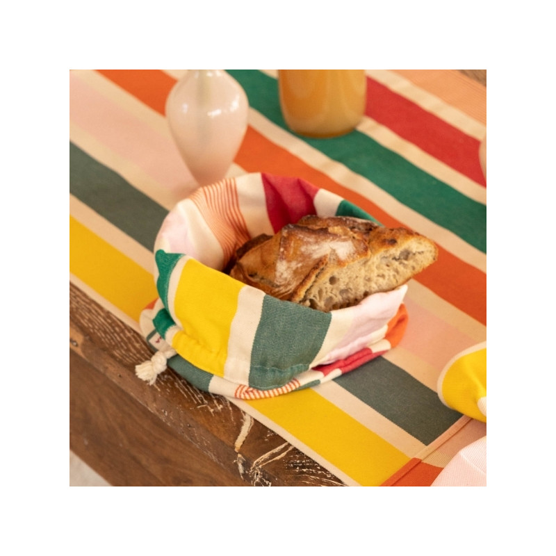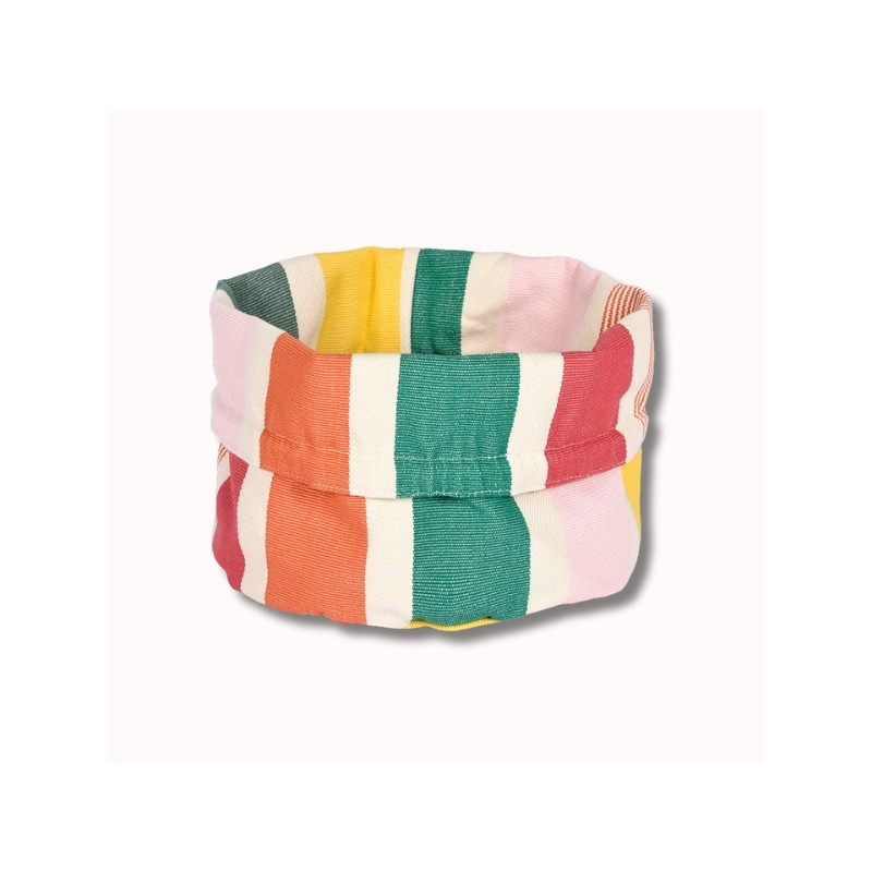 Confectionnée en toile 100% coton, la corbeille Garlin Melon est souple, résistante et agréable au toucher. Son motif iconique associe des rayures fruitées et chaleureuses mêlant framboise, melon, jaune lumineux, rose pâle et deux nuances de vert (vert gris et vert eucalyptus), pour une table pleine de vie.
