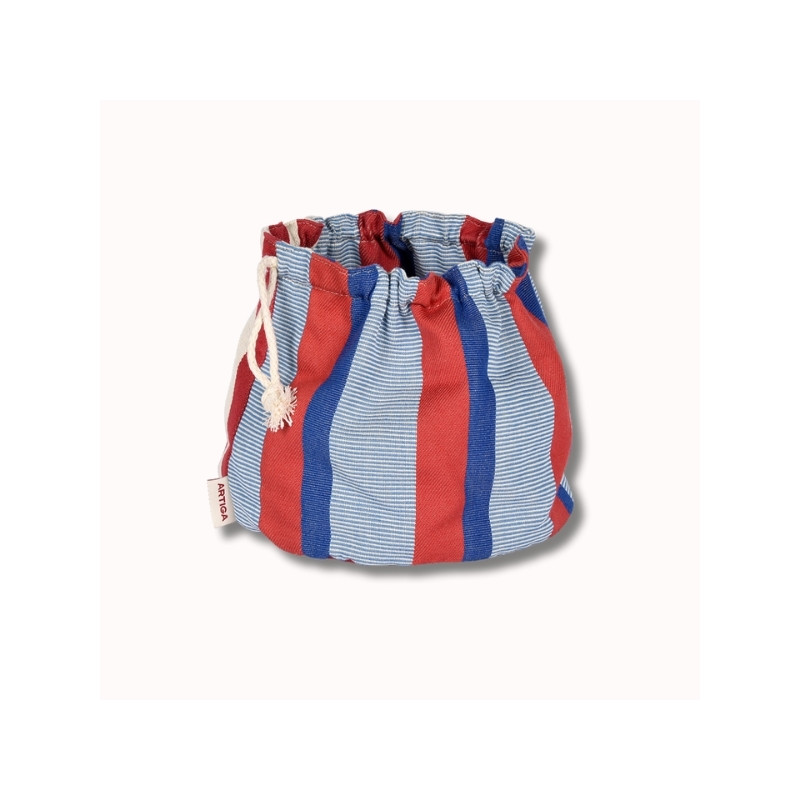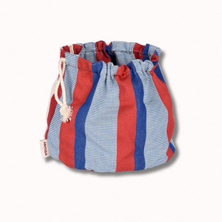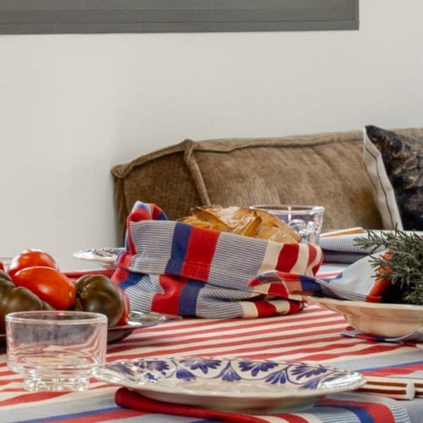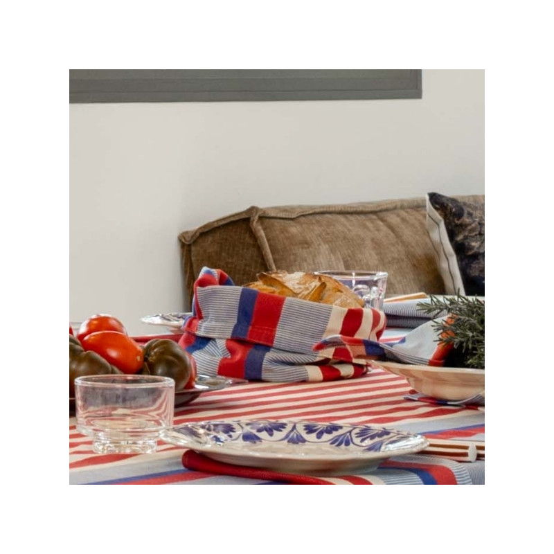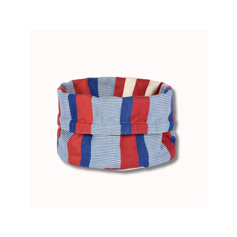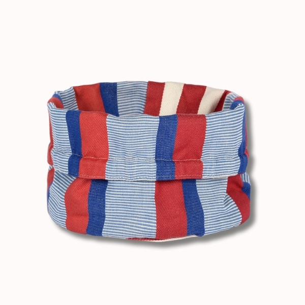 Réalisée dans la toile Moustey, cette corbeille se distingue par ses rayures graphiques bleu, rouge et écru, inspirées des carrelages méditerranéens et revisitées dans l’esprit « La Française » : un univers chic, raffiné et travaillé, mêlant tradition et modernité. Les différentes armures de tissage apportent du relief et une richesse visuelle qui font toute la singularité de cette toile.