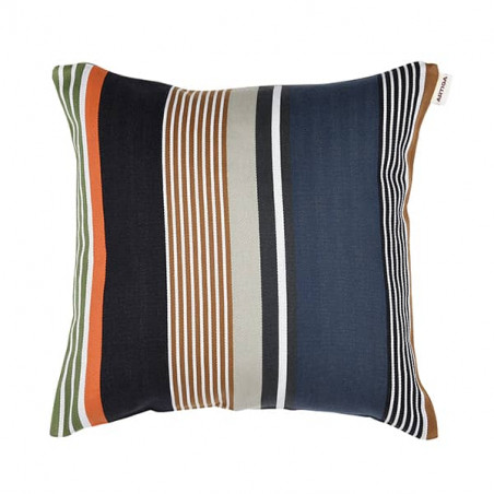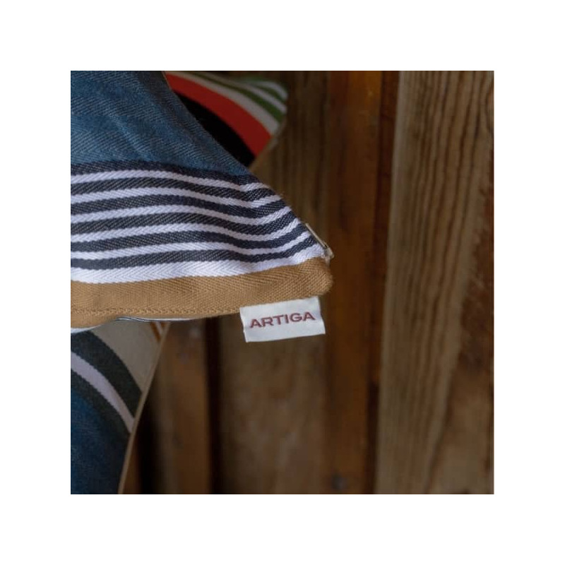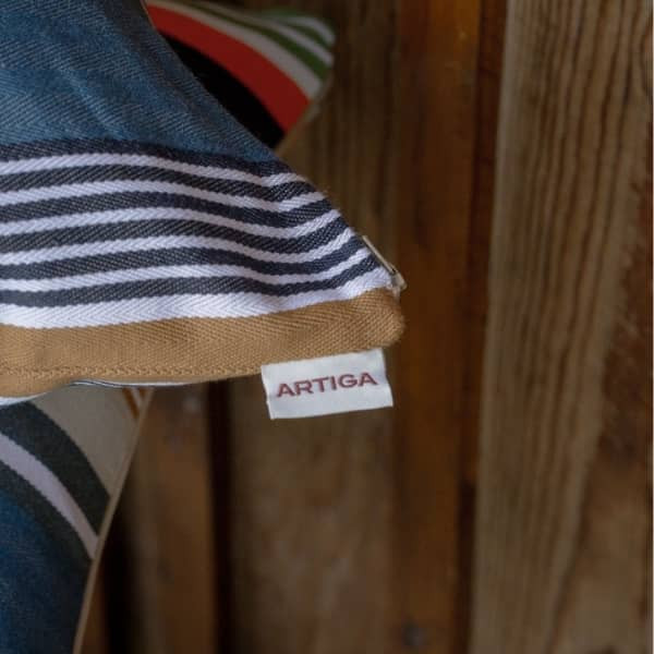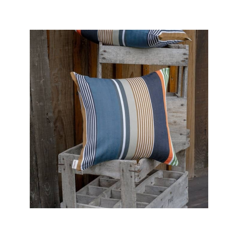 Confectionné dans notre atelier Artiga à Magescq, ce coussin met en valeur les rayures masculines et rythmées de la collection capsule Automne-Hiver 2025.
