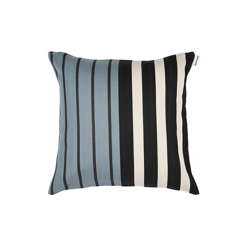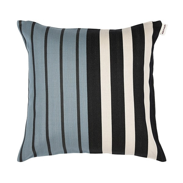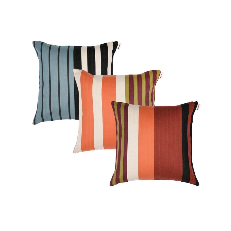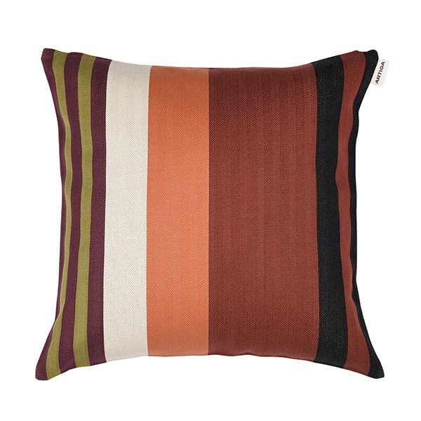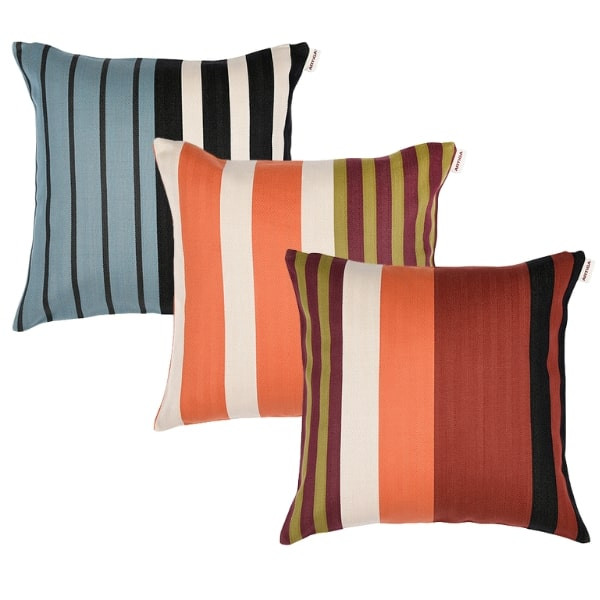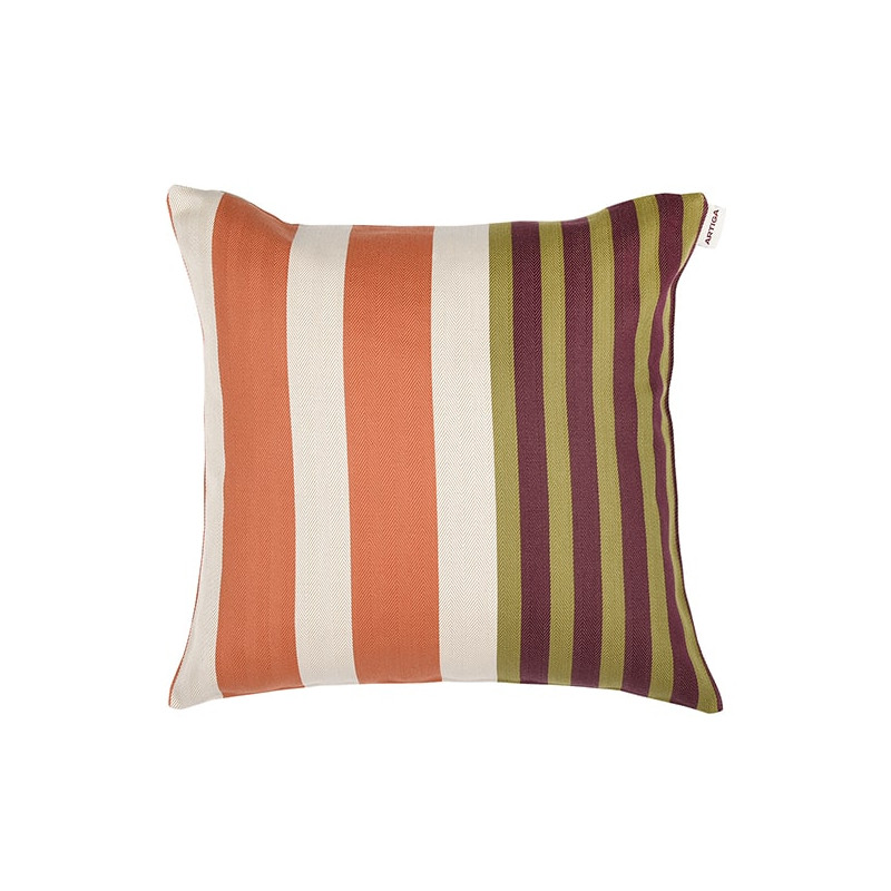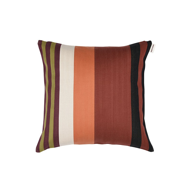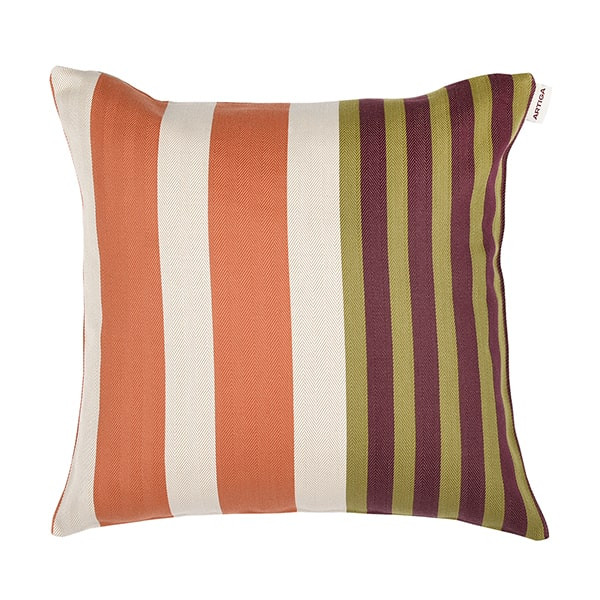 Le coussin Cazalis 40x40 cm habille votre intérieur avec ses rayures audacieuses et colorées : terracotta, olive, noir, écru et bleu glacier.