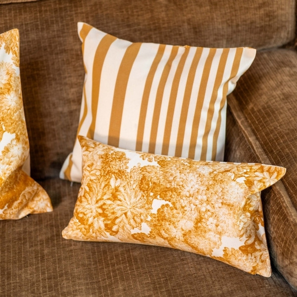 Sur une face, la toile Adour Curry dévoile ses rayures chaleureuses aux tons curry sur fond écru, évoquant une atmosphère douce, naturelle et intemporelle. De l’autre, la toile Tree for Two Curry, née de la collaboration entre Artiga et Thévenon, apporte une touche poétique et graphique, inspirée de la nature et du calme des paysages contemplatifs.