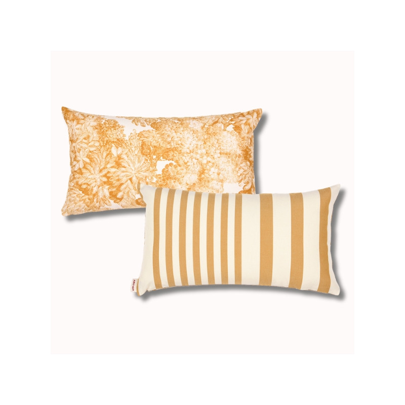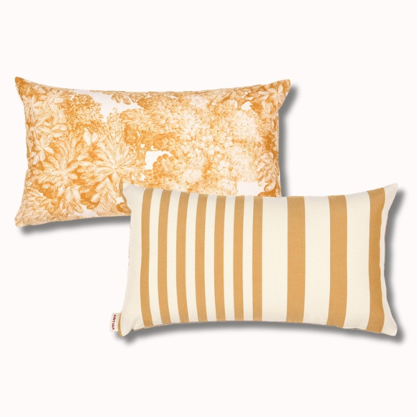 Une face en toile Adour Curry, aux rayures écru et curry, apporte une touche naturelle, douce et facile à assortir. L’autre face dévoile le motif Tree for Two Curry, issu de la collaboration Artiga x Thévenon, un décor végétal en jaune curry chaleureux évoquant le calme et la contemplation de la nature.