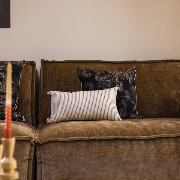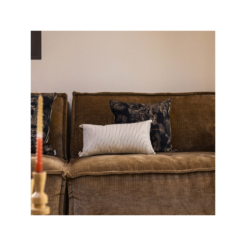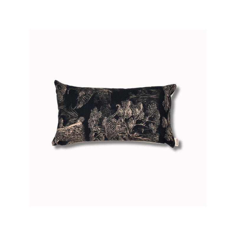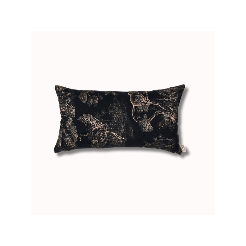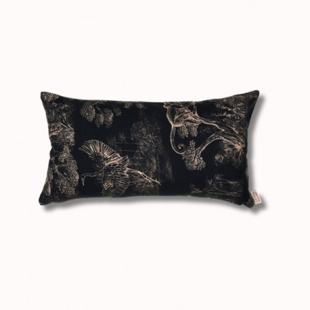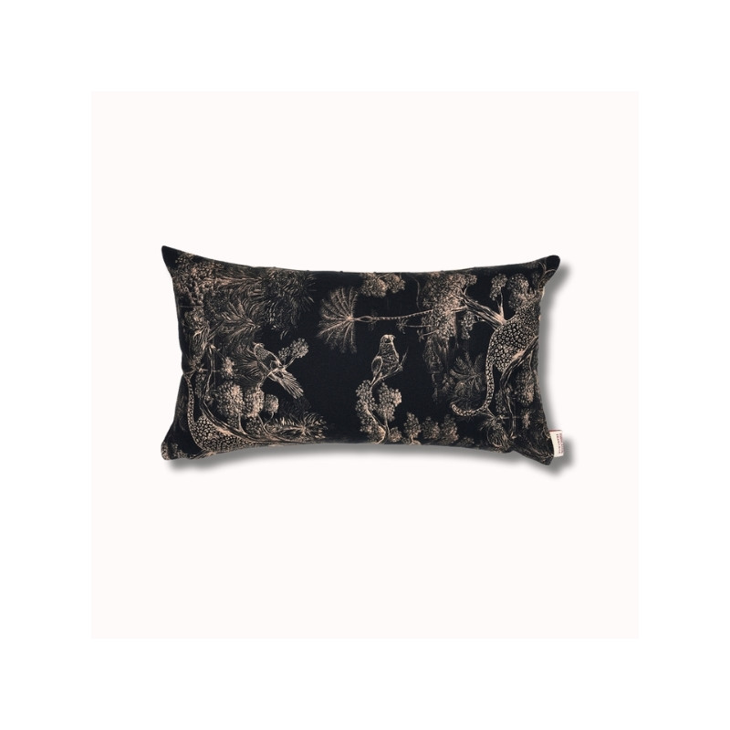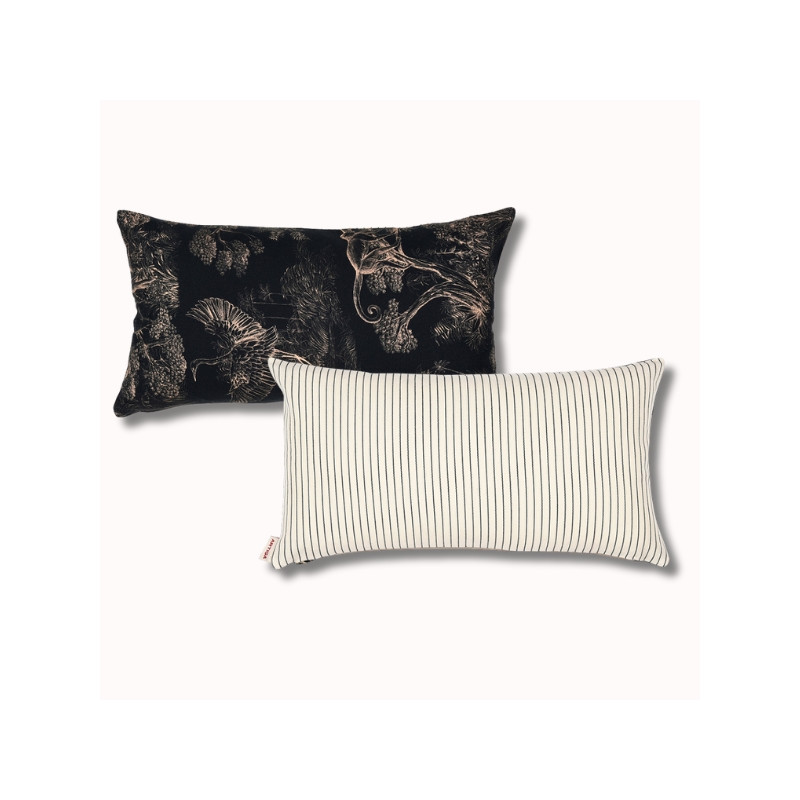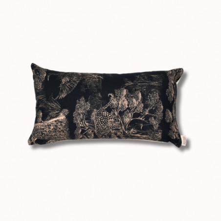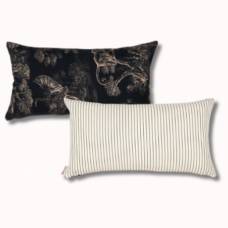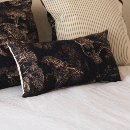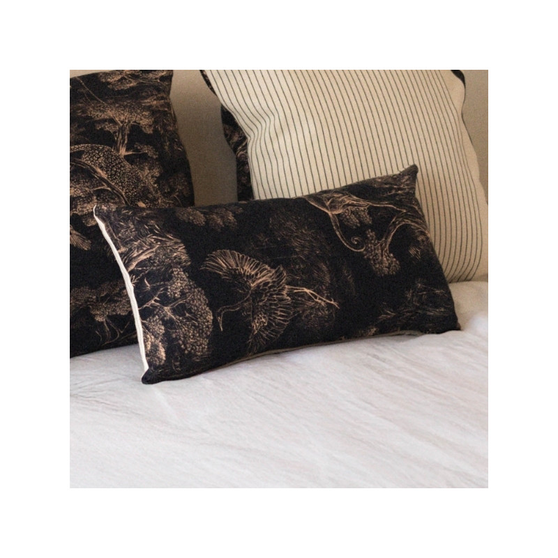 Au verso, le motif Animalia signé Thevenon révèle un univers dense et poétique, où faune et végétation s’entrelacent dans un dessin raffiné. Inspiré de la nature, ce motif crée une atmosphère chaleureuse et expressive. Le placement du dessin pouvant varier, chaque coussin est une pièce unique.