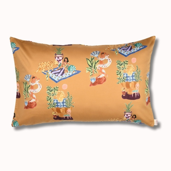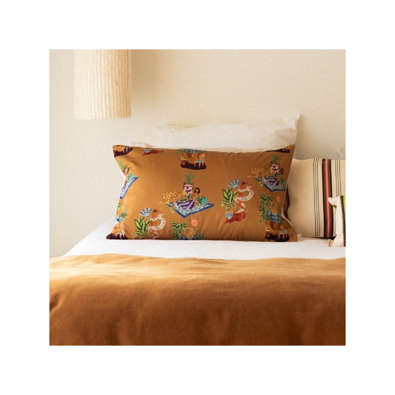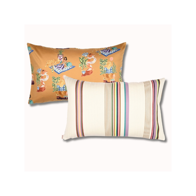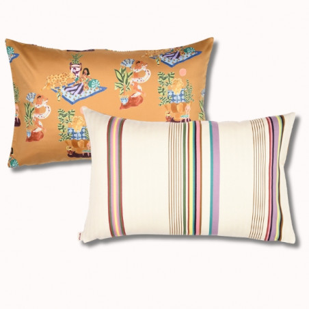 Grâce à son format 70 x 45 cm, ce coussin est idéal pour habiller un lit, un canapé, un fauteuil ou une banquette. Biface, il permet de changer d’ambiance en un geste, en alternant entre sobriété graphique et décor narratif.