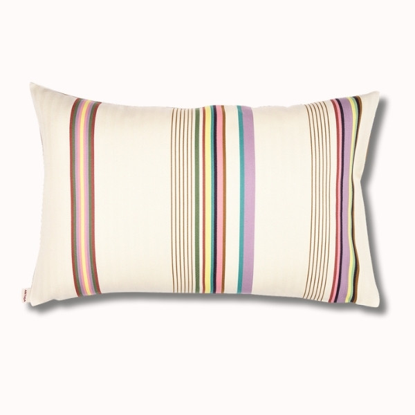 Sur une face, la toile SORE dévoile un jeu de rayures fines, chevrons et bandes centrales parfaitement équilibrées. Son fond écru lumineux, ponctué de touches citronnées, parme, vert et rose, évoque l’univers « Les Pins Salés » : des ambiances épurées, naturelles et chaleureuses, pensées comme une maison de vacances tournée vers la douceur de vivre.