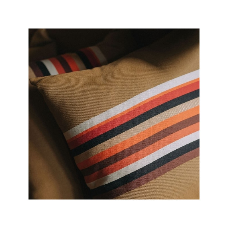 Les rayures Mauléon, inspirées du design traditionnel de l’espadrille, sont ici réinventées dans des teintes automnales – bruns, cuivrés, orangés et noirs – qui évoquent les matières nobles comme le bois ou le cuir.