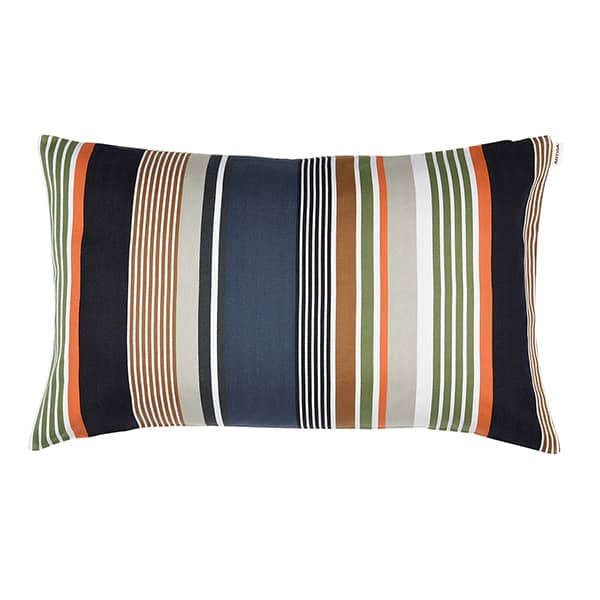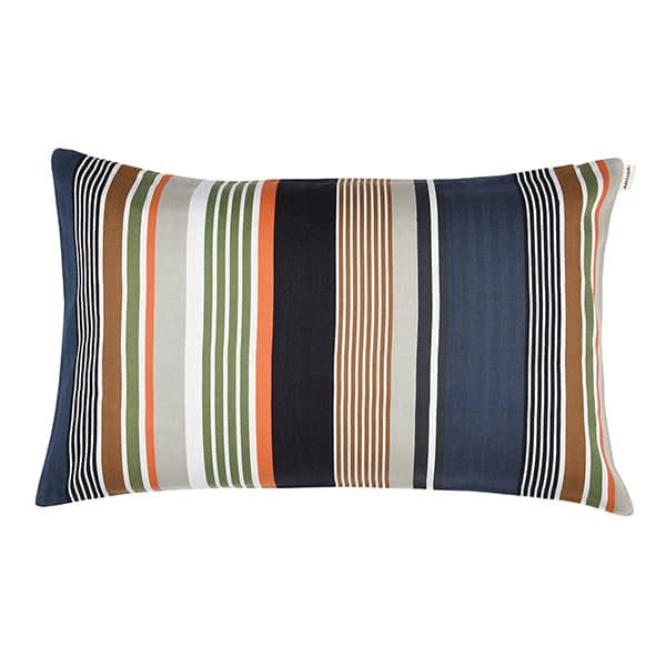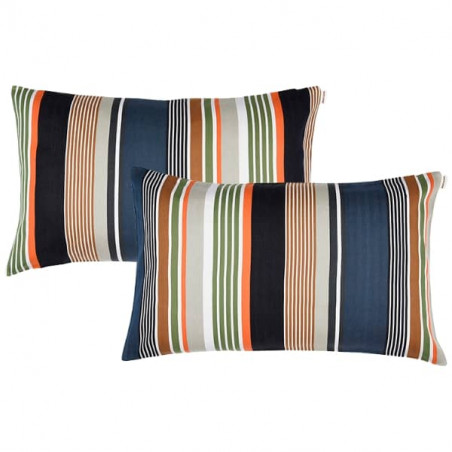 Le coussin rectangulaire Argelos 70x45 cm est une création issue de la collection capsule Automne-Hiver 2025. Ses rayures dynamiques, mélange de tons froids (bleu nuit, gris, vert) relevés par des touches vives (orange brûlé, blanc), apportent du rythme et du style à votre décoration.