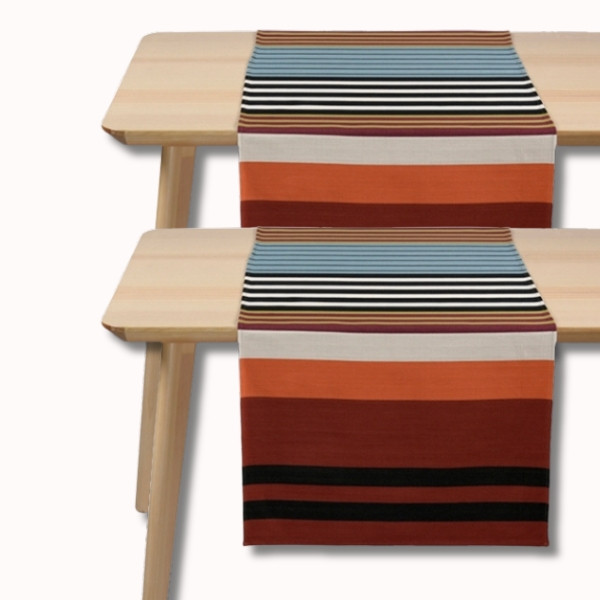 Aussi appelé chemin de table, ce modèle au format idéal 155 x 50 cm structure votre table avec caractère tout en apportant une touche décorative chaleureuse. Ses rayures dynamiques associent des teintes naturelles et contemporaines : vert olive, terracotta, melon, bleu glacier, noir et écru, pour un rendu à la fois équilibré et audacieux.