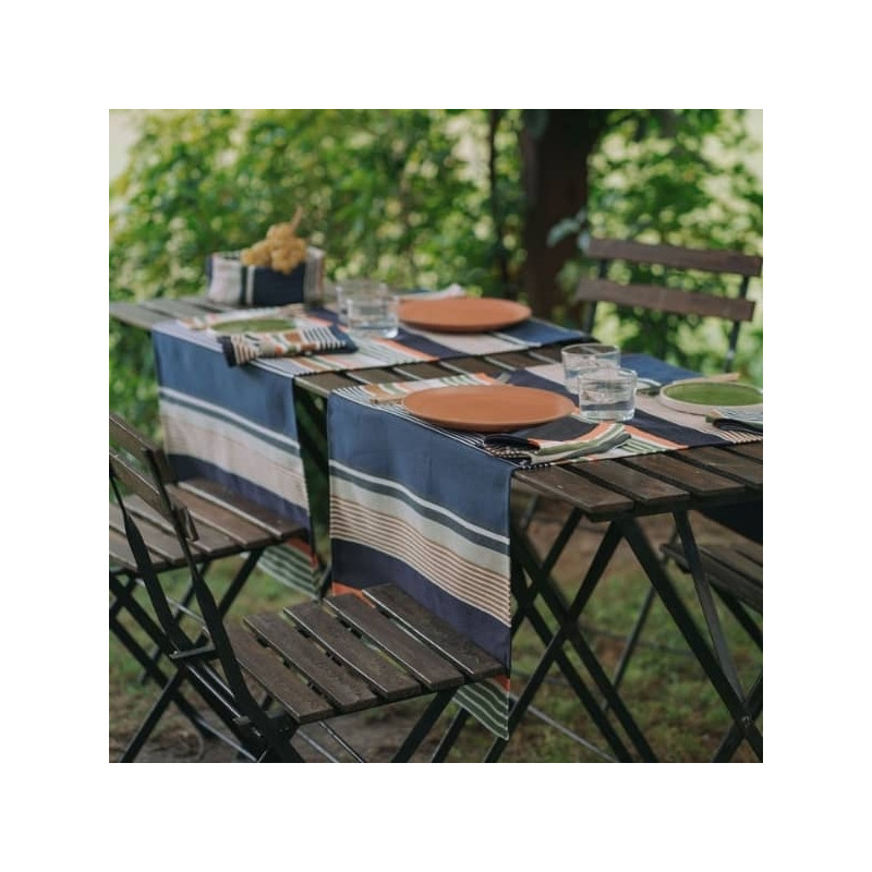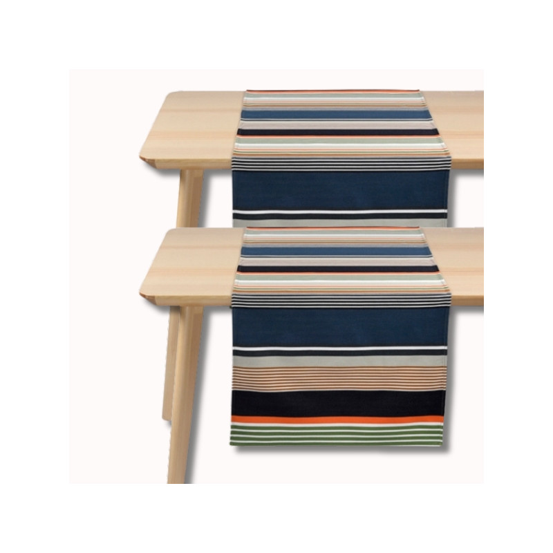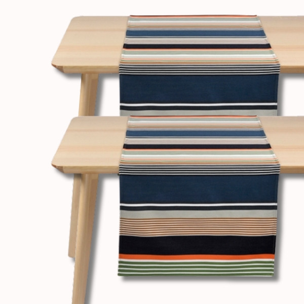Aussi appelé chemin de table, ce modèle au format idéal 155 x 50 cm habille votre table avec élégance tout en structurant votre espace. Ses rayures graphiques rythmées mêlent des tons profonds comme le bleu, le vert, le brun et le noir, à des touches lumineuses d’orange, créant un contraste moderne et raffiné.