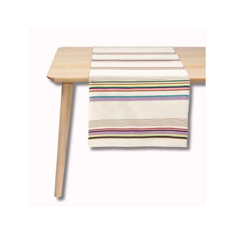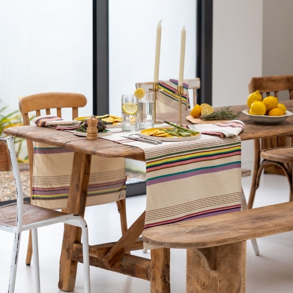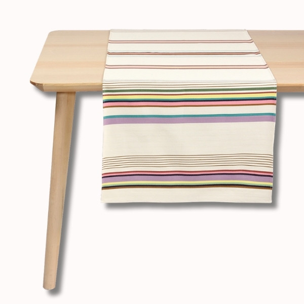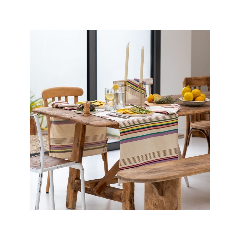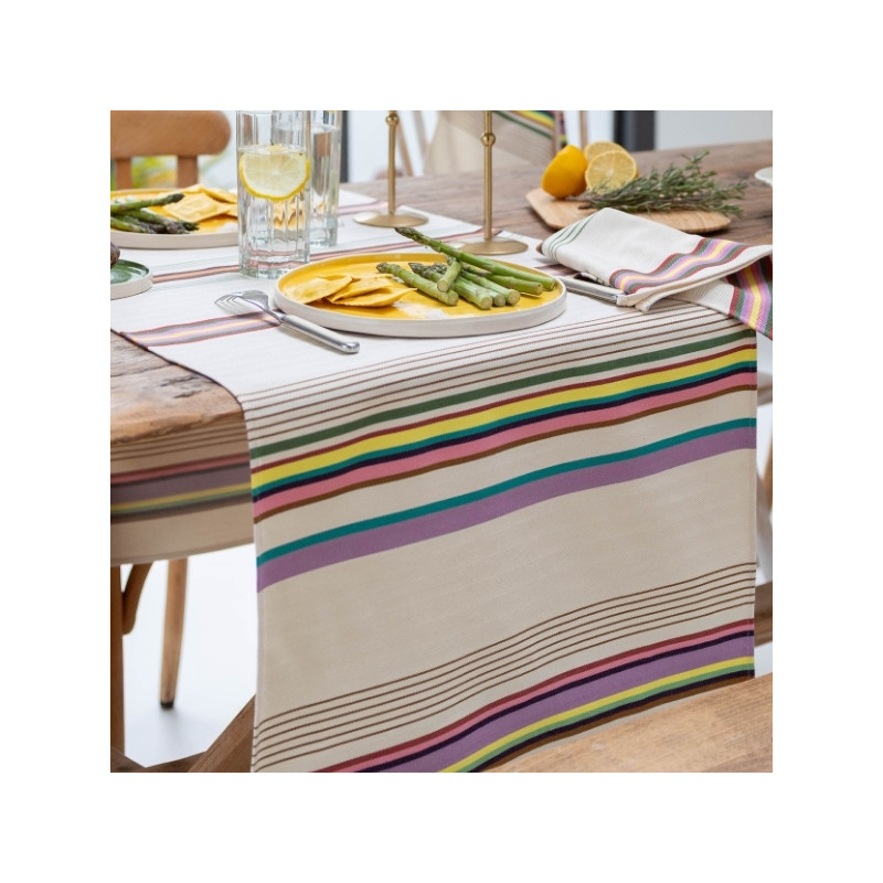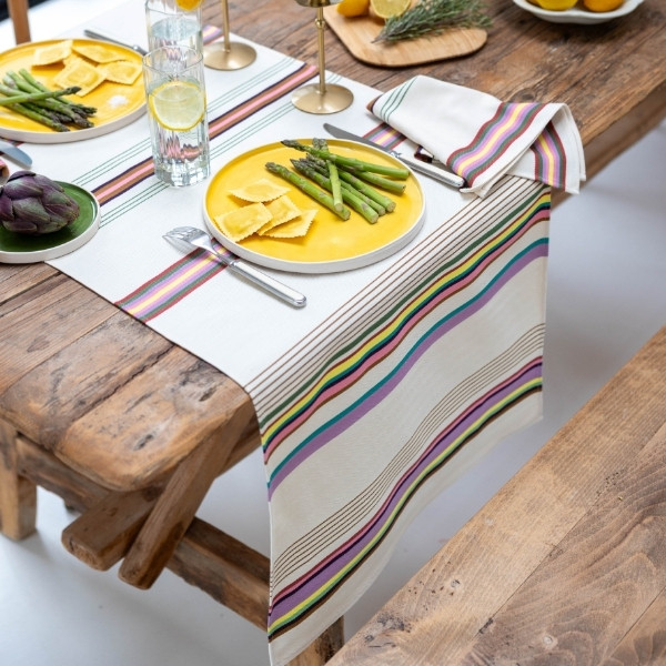 Issu de l’univers Les Pins Salés, ce jeté de table se distingue par son fond écru lumineux et ses rayures fines et colorées, harmonieusement réparties autour d’une bande centrale symétrique. Les touches citronnées, rosées, parmes et vertes évoquent une maison de vacances baignée de lumière, où le bois et les matières naturelles trouvent naturellement leur place.