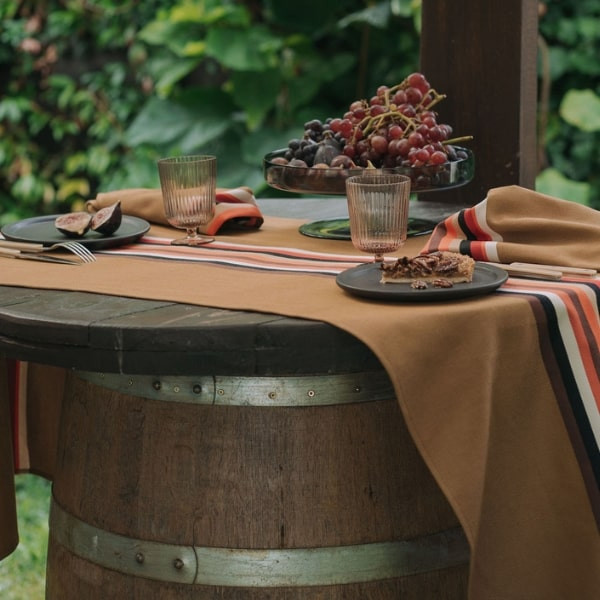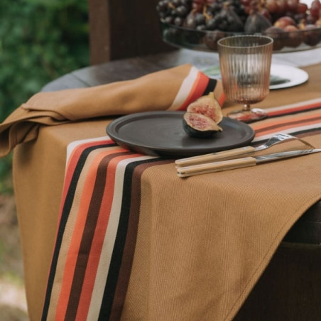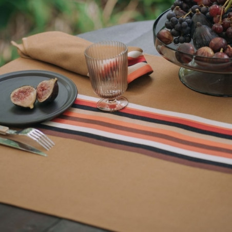 Ses rayures emblématiques inspirées de l’espadrille se déclinent sur un fond vison aux teintes automnales, parfait aussi bien pour une ambiance cosy que pour vos tables de fête de fin d’année.