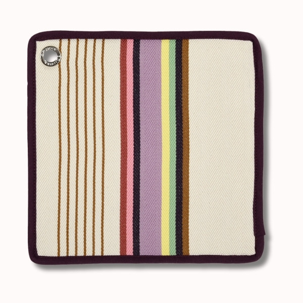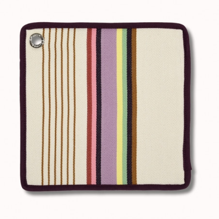 Issue de l’univers « Les Pins Salés », la toile Sore se distingue par son fond écru lumineux, ses rayures fines et sa bande centrale symétrique aux accents citronnés, rosés et parme. Un équilibre subtil entre sobriété et fraîcheur, inspiré des maisons de vacances du Sud-Ouest, où la lumière, le bois et les matières naturelles dialoguent avec douceur.