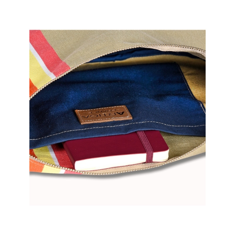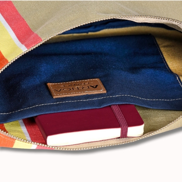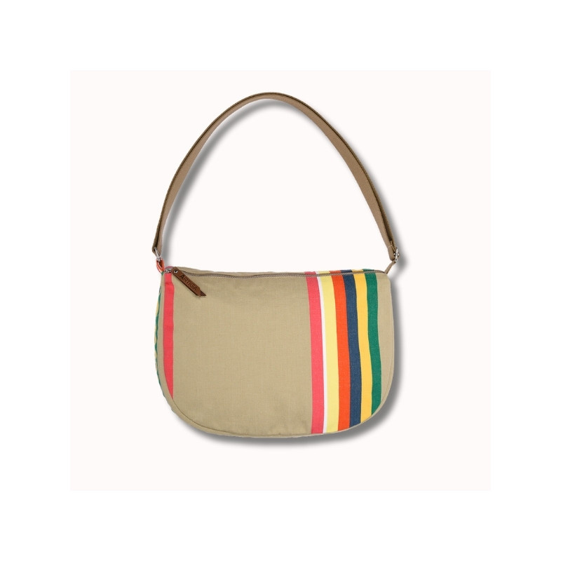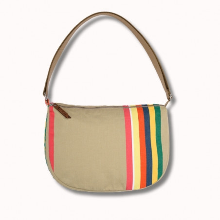 Le sac Bertille Mauleon Lin séduit par son fond naturel beige relevé par de belles rayures vives multicolores.