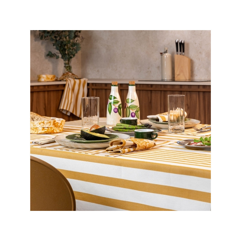 Issue de l’univers Les Pins Salés, cette nappe s’inspire des maisons de vacances, où l’on aime recevoir simplement, dans un cadre apaisant et authentique. Sa base écru rehaussée de rayures curry crée un équilibre subtil entre douceur, élégance et convivialité.