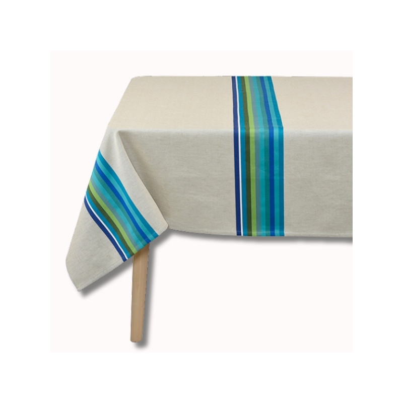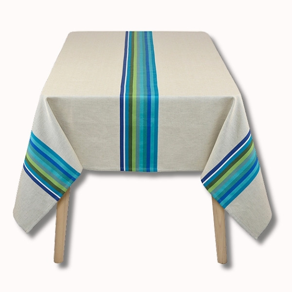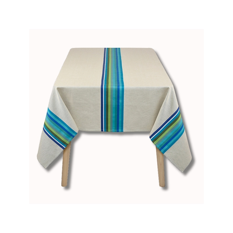 La nappe Mauléon Turquoise est en tissu naturel 70% coton et 30% lin, créée et confectionnée dans notre atelier situé dans le Sud-Ouest, dans le respect des tissages traditionnels basques.