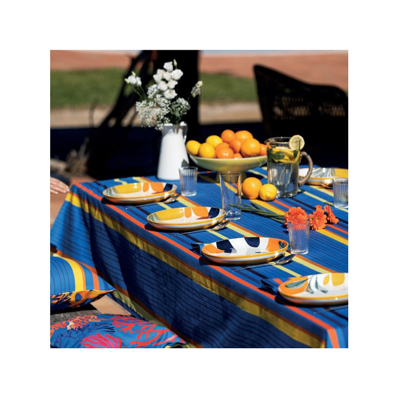 La nappe Laurede est en tissu naturel 75% coton issu de l'agriculture biologique et 25% coton et autres fibres recyclées, créée et confectionnée dans notre atelier situé dans le Sud-Ouest, dans le respect des tissages traditionnels basques.