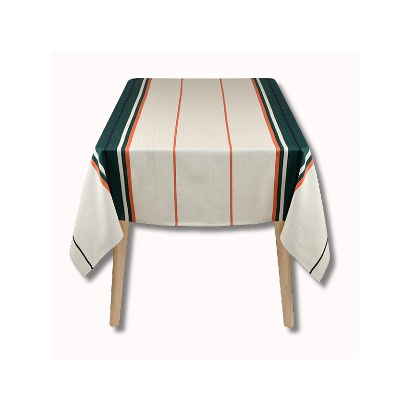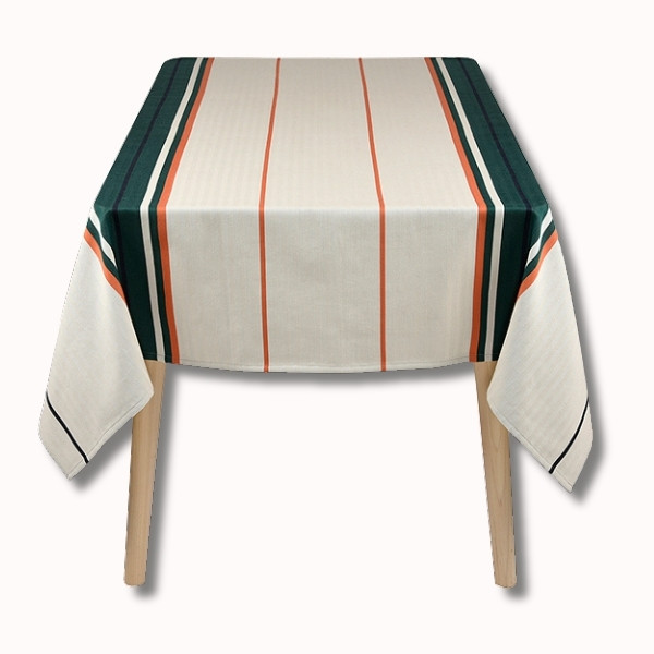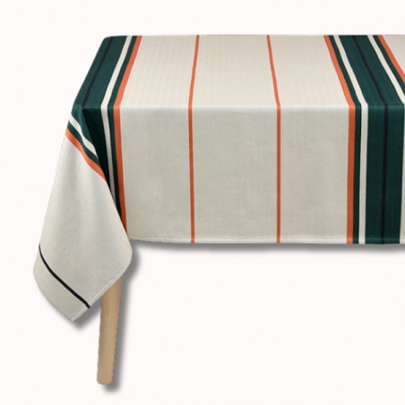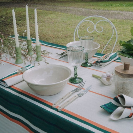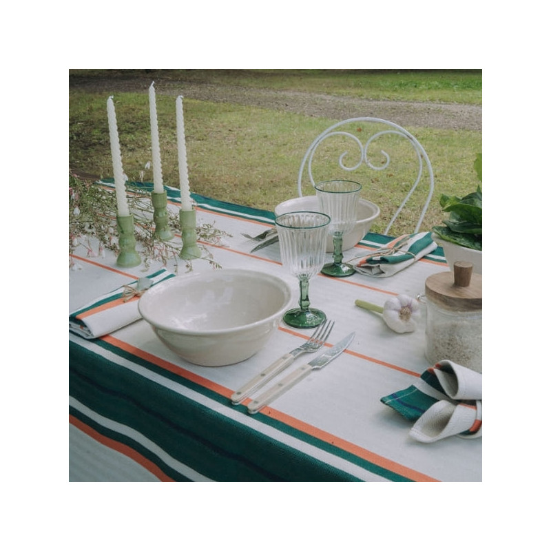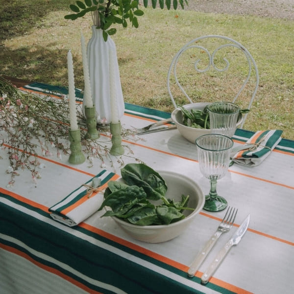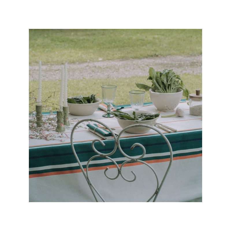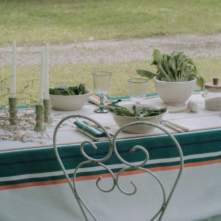La nappe Vanoise est le fruit d’une collaboration entre Artiga et la marque Eaux & Forêts. Ses rayures vert profond et orange terre cuite rappellent la richesse et la chaleur de nos paysages boisés.