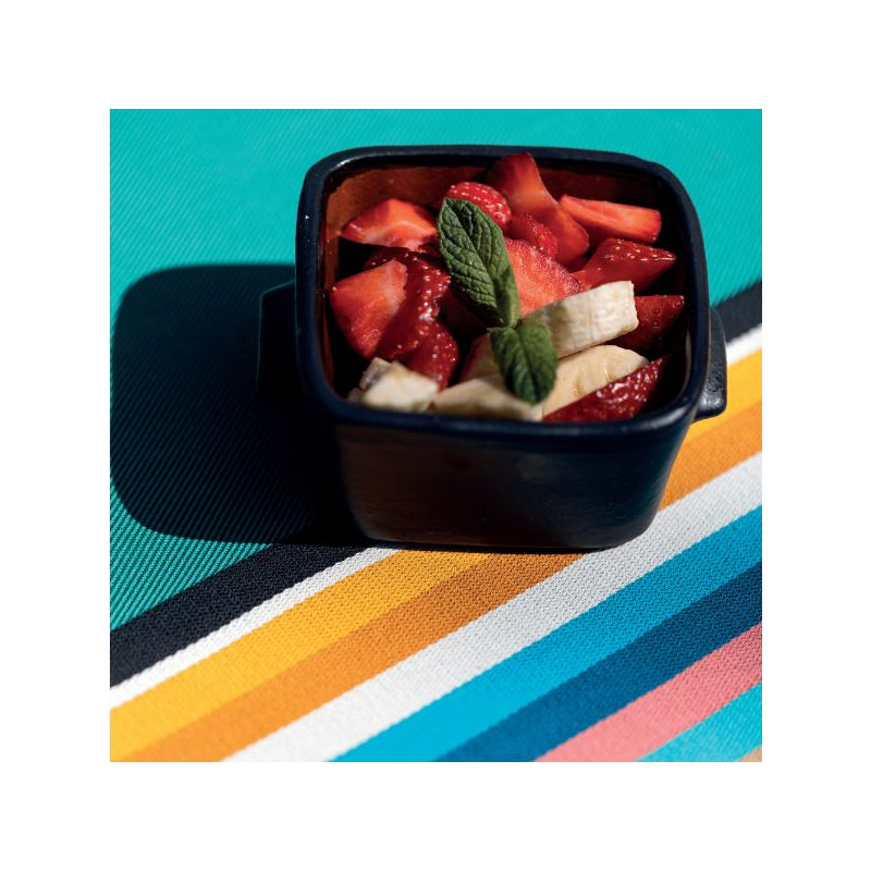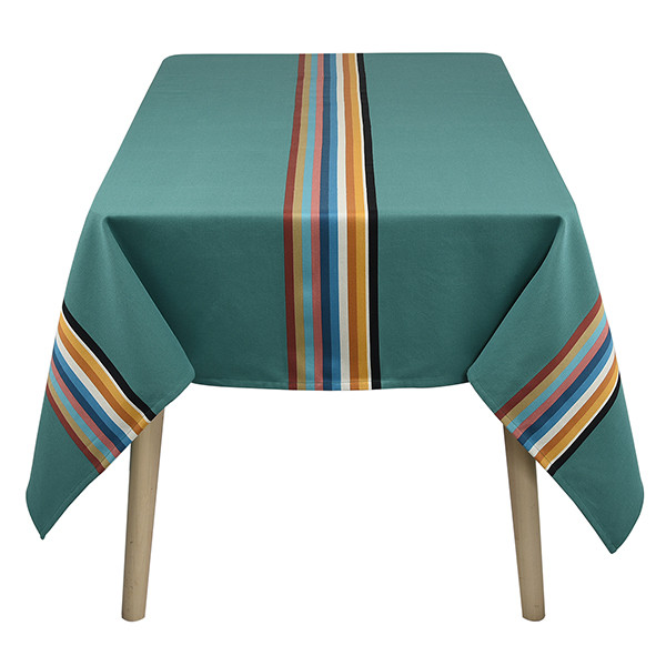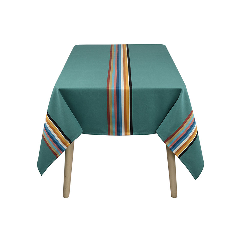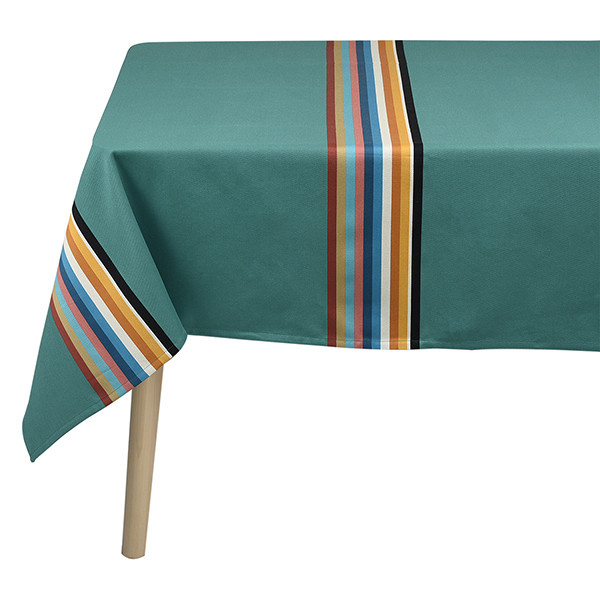 La nappe Mauléon Menthe est en tissu naturel 100% coton issu de l'agriculture biologique, créée et confectionnée dans notre atelier situé dans le Sud-Ouest, dans le respect des tissages traditionnels basques.