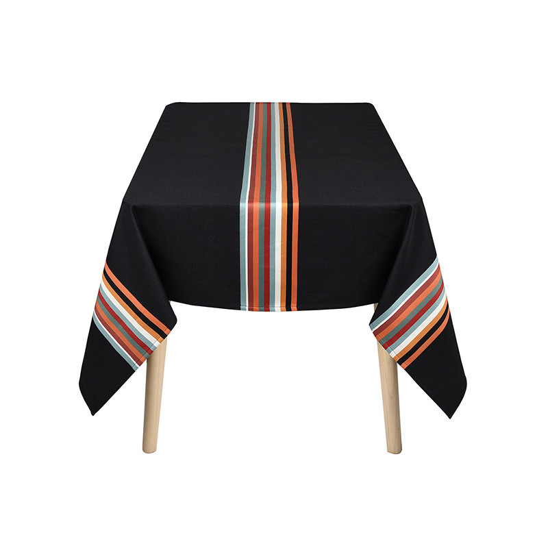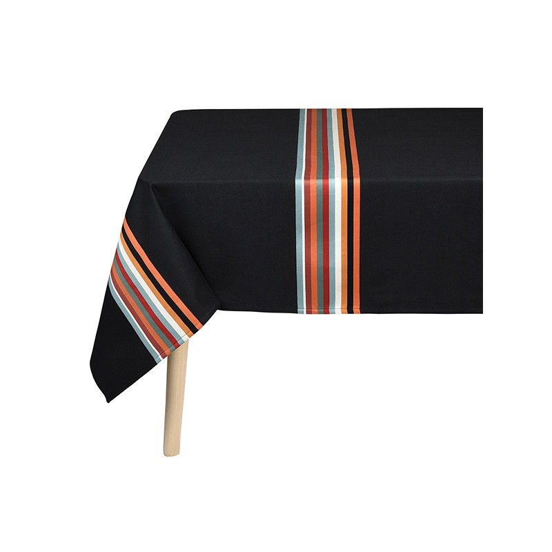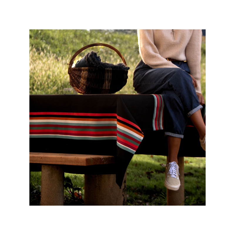 La nappe Mauléon Noir est en tissu naturel 100% coton issu de l'agriculture biologique, créée et confectionnée dans notre atelier situé dans le Sud-Ouest, dans le respect des tissages traditionnels basques.