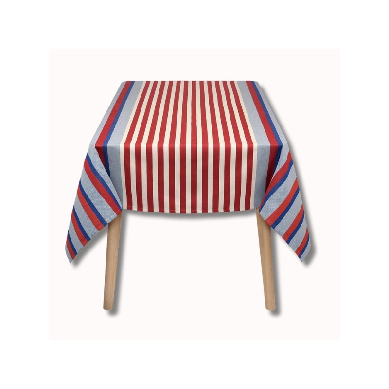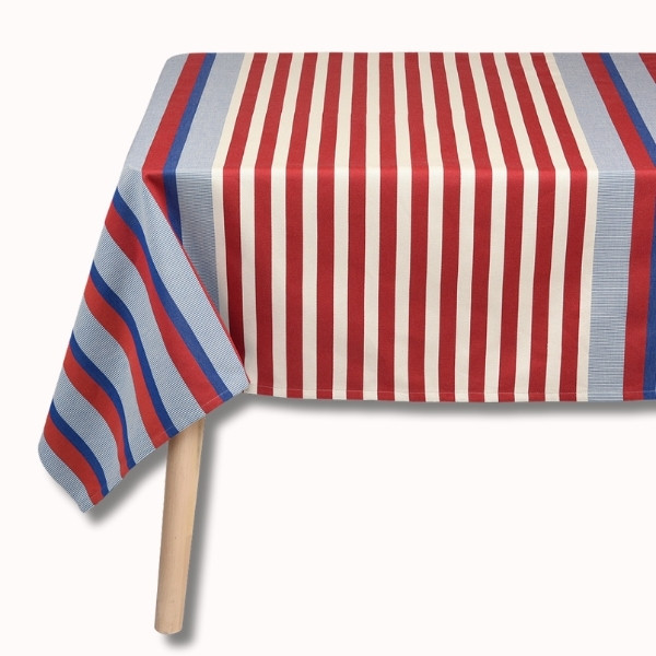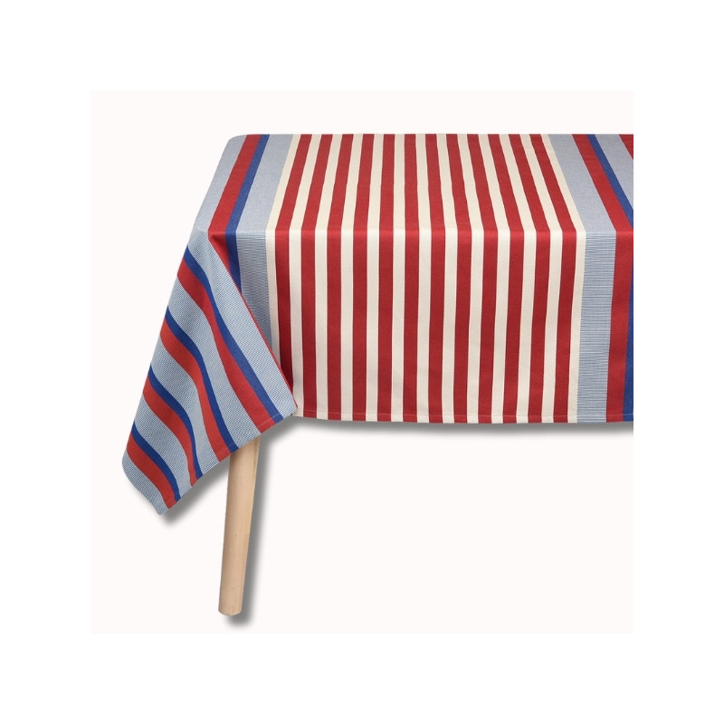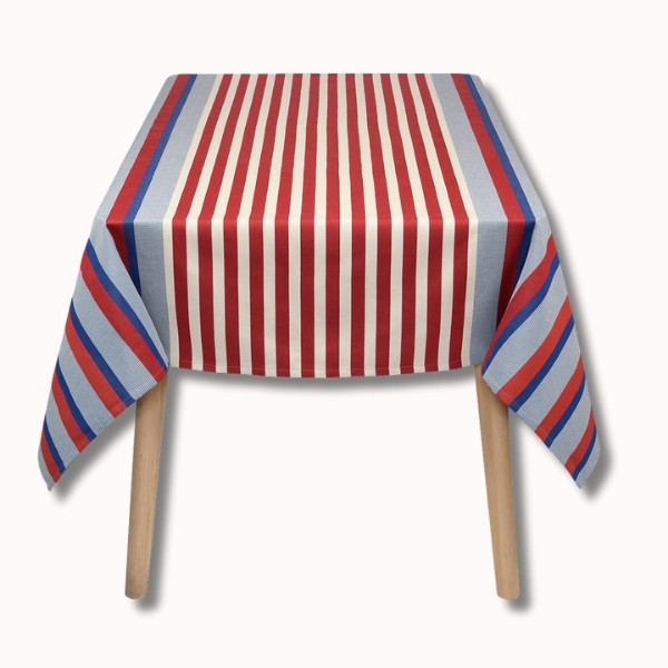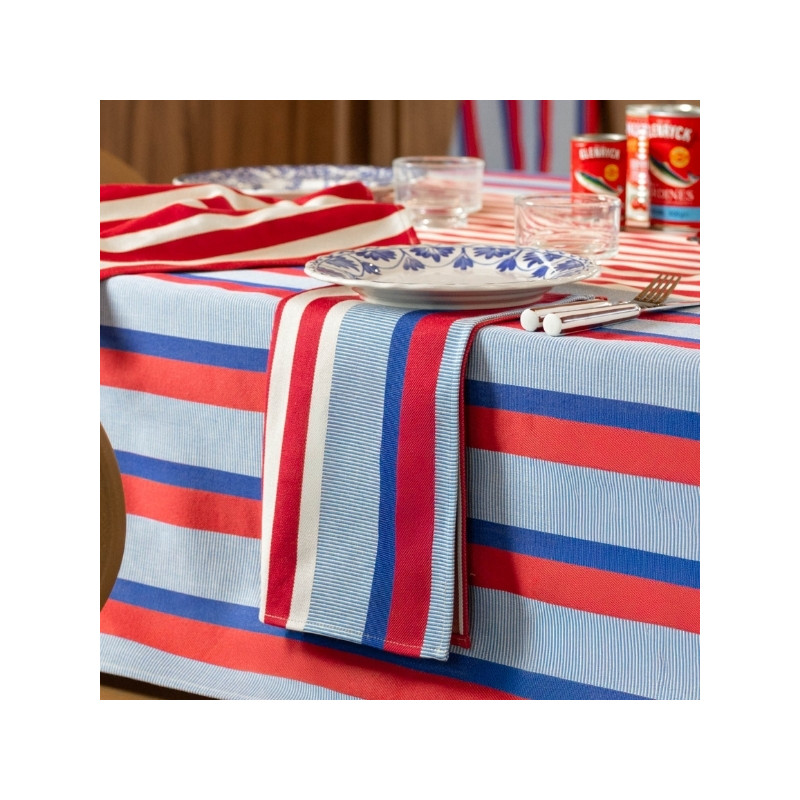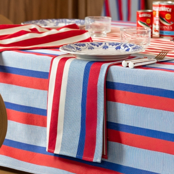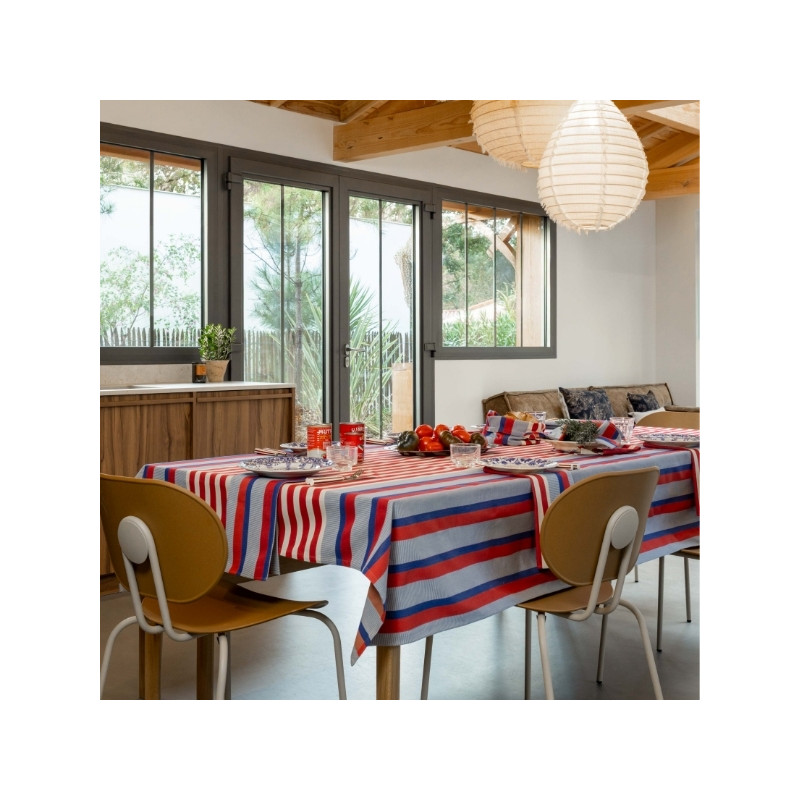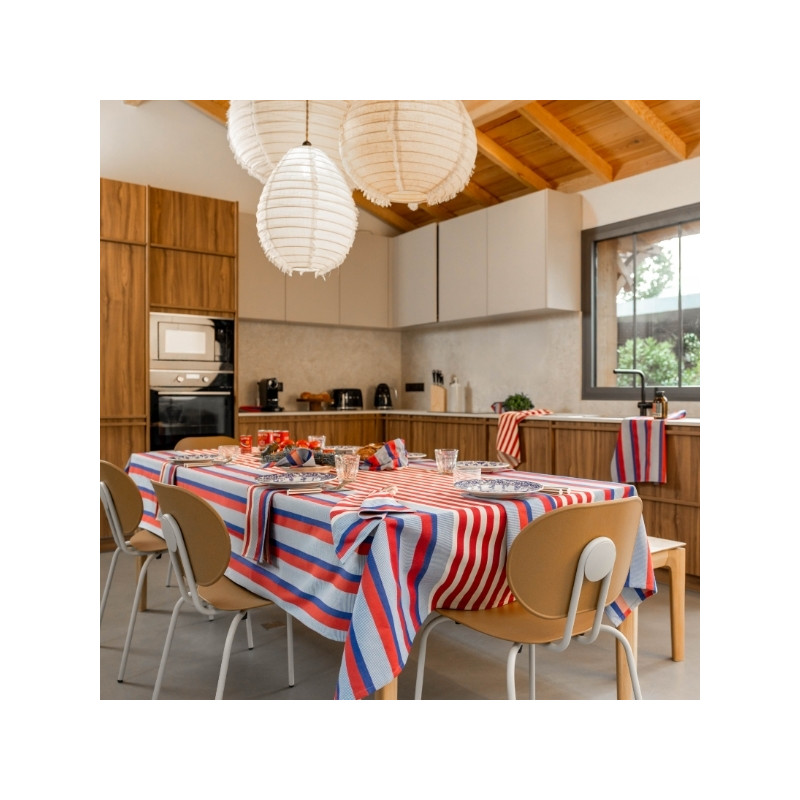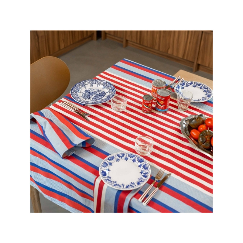 Son motif rayé associe différents bleus lumineux et rouges profonds, évoquant à la fois les carrelages méditerranéens, l’art de vivre du Sud et l’élégance structurée de l’univers La Française. Les variations de tissage apportent du relief et du caractère à la nappe, pour un rendu chic et travaillé.