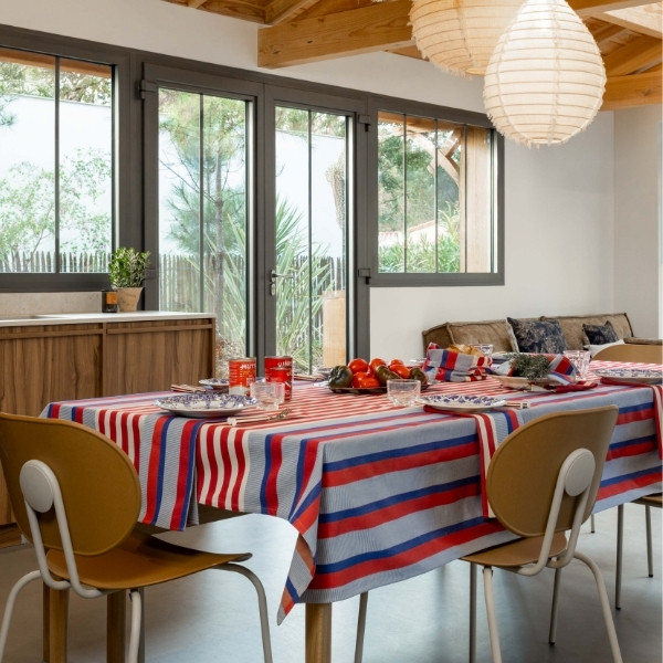 La nappe en coton Moustey incarne l’élégance à la française à travers un jeu de rayures graphiques rouges et bleues, inspirées des univers méditerranéens et du textile d’inspiration basque.