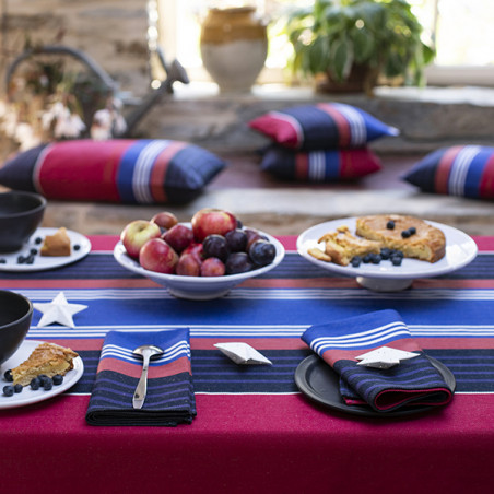 Toile chevrons de caractère qui associe marine, bleu roi, rouge, prune et terracotta. Elle se prête notamment à de belles tables automnales ou festives, mais vous pourrez également booster votre déco avec coussins ou rideaux dans cette toile.