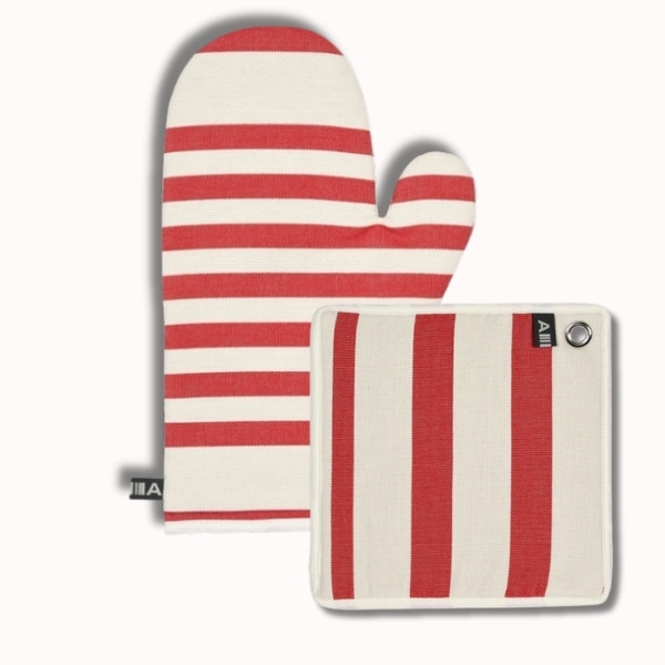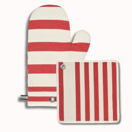 Leur motif à rayures rouges, inspiré de la chaleur des repas conviviaux méditerranéens, apporte vitalité et élégance à votre cuisine. La manique est idéale pour manipuler vos plats chauds avec précision, tandis que la moufle assure une couverture complète pour sortir vos préparations du four en toute sécurité.
