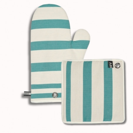 Leur motif à rayures vertes, inspiré des marchés d’herbes fraîches et des jardins méditerranéens, apporte fraîcheur et raffinement à votre cuisine. La manique est idéale pour une prise rapide et précise, tandis que la moufle couvre et sécurise parfaitement la main pour sortir vos plats du four.