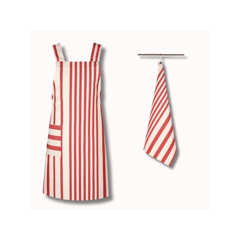Leur motif à rayures rouges, inspiré de la chaleur des repas conviviaux méditerranéens, apporte élégance et vitalité à votre cuisine. Fabriqués dans notre atelier du Sud-Ouest, tablier et torchon sont certifiés Origine France Garantie et labellisés SUD Terre Textile, gages d’un savoir-faire textile local et durable.