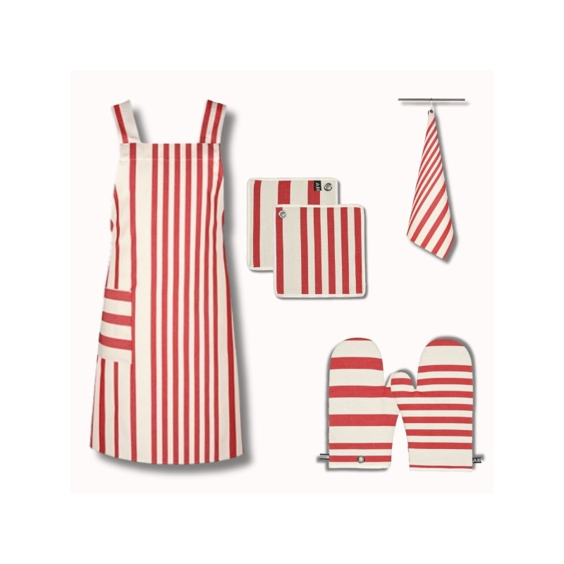 Leur motif à rayures rouges, inspiré de l’ambiance chaleureuse des repas méditerranéens, apporte vitalité et élégance à votre cuisine. Fabriqués dans notre atelier du Sud-Ouest, ces accessoires sont certifiés Origine France Garantie et labellisés SUD Terre Textile, gages de savoir-faire local et de qualité durable.