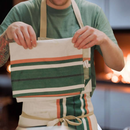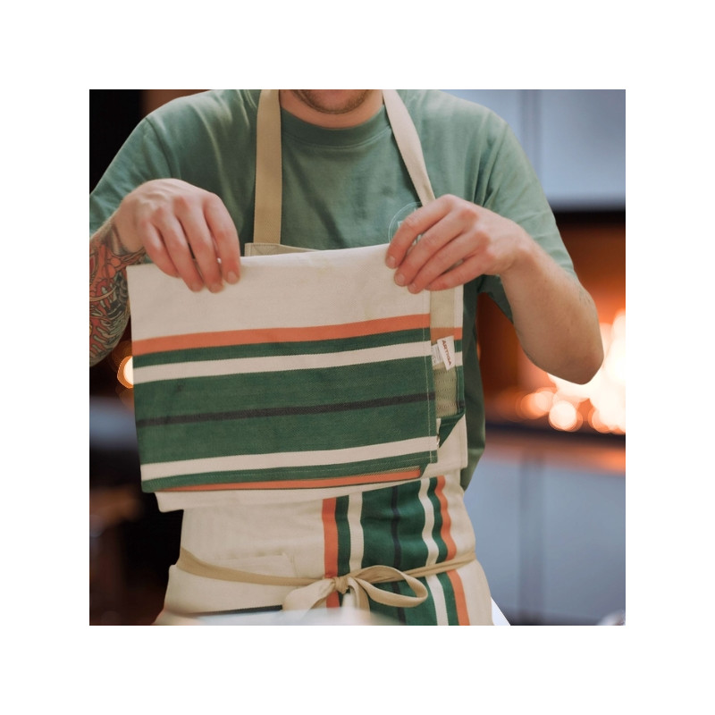 Pack Tablier Vanoise 78×90 cm + Torchon œillet 70×50 cm. Métis coton/lin, fabrication française. Un duo naturel et élégant pour cuisiner pendant les fêtes.