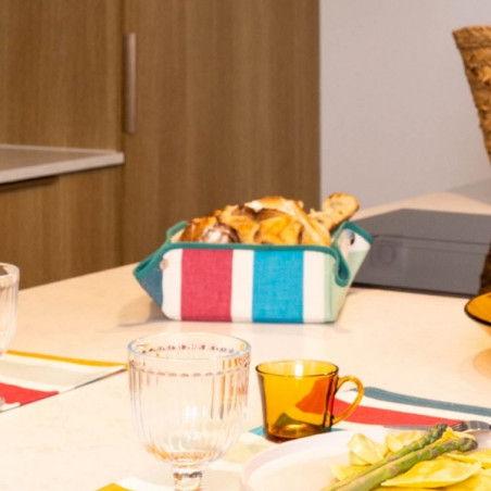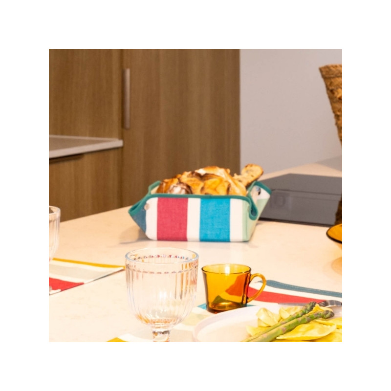 Inspirée de l’univers « Matin dans les Landes », cette panière évoque la douceur des premières heures du jour, lorsque la lumière traverse les pins et révèle des teintes à la fois fraîches et chaleureuses. Les rayures Garlin Céladon associent des tons de vert céladon, gris vert et turquoise, subtilement réchauffés par des touches orangées et rouges, créant une harmonie lumineuse et naturelle.