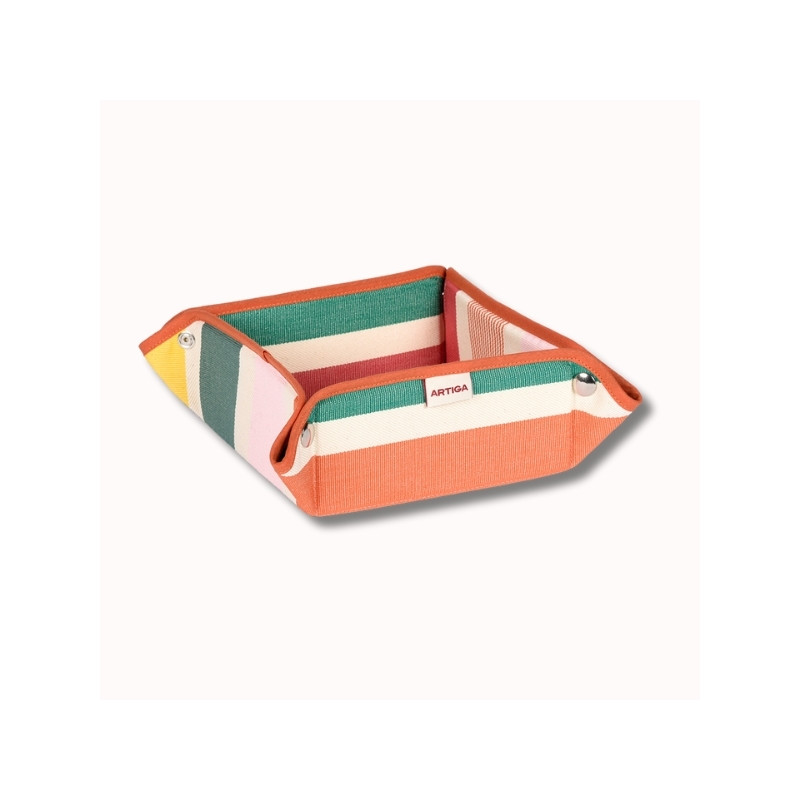 Confectionnée en tissu naturel 100% coton, cette panière séduit par sa toile rayée lumineuse aux couleurs fruitées : melon, framboise, jaune doré, rose pâle et verts subtils (vert gris et vert eucalyptus).