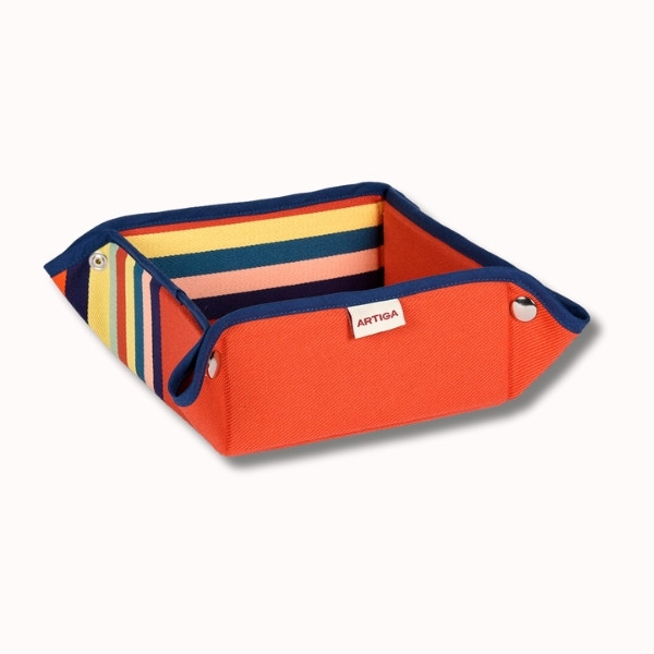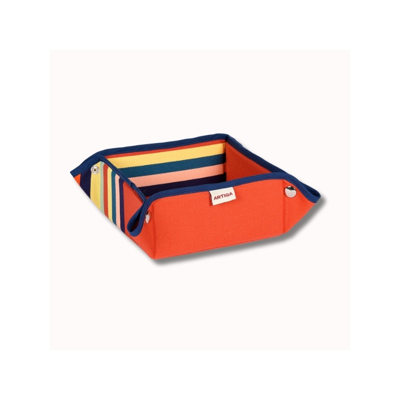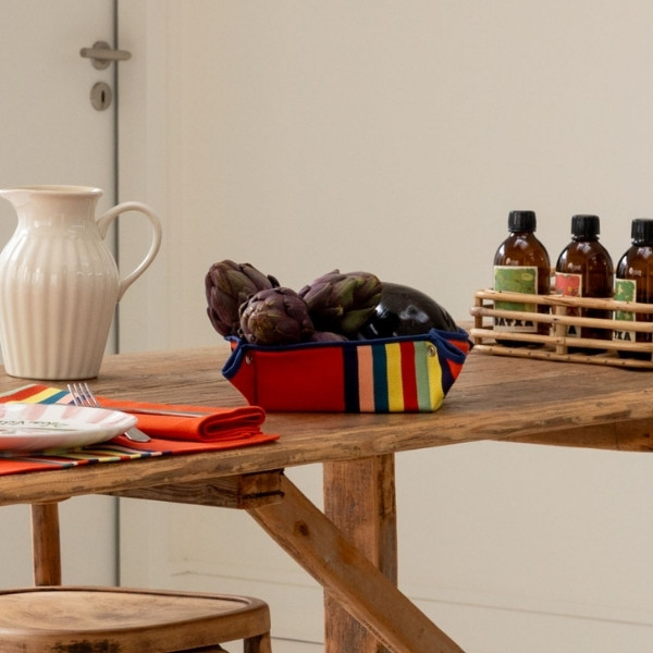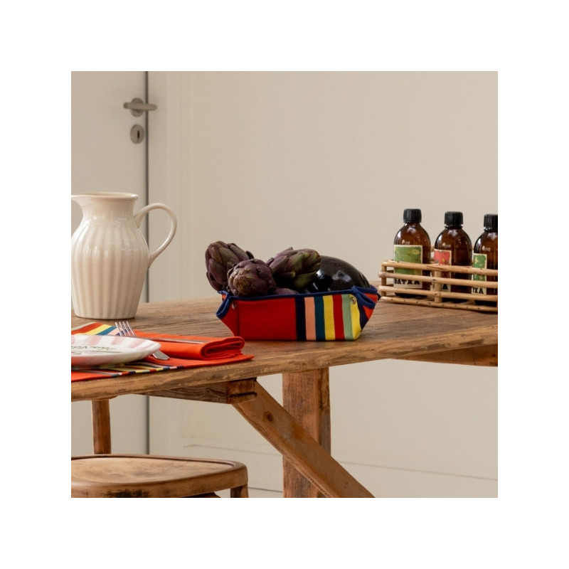 Issue de l’univers Déjeuner sur l’herbe, cette panière évoque les plaisirs simples de l’été : repas en plein air, pique-niques colorés, tables conviviales et ambiances fraîches et fruitées. Son fond orange éclatant, inspiré des agrumes et du plein été, est sublimé par des rayures multicolores aux accents jaune citron, vert amande, bleu indigo et pétrole.