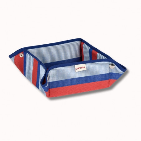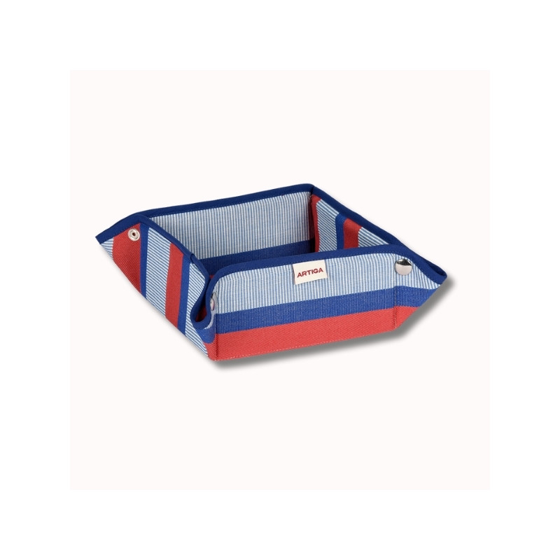 Panière de table 17x17x8 cm au design rayé élégant, pratique et modulable grâce à ses pressions métalliques, confectionnée en 100 % coton dans notre atelier de Magescq. Un accessoire de table raffiné issu de l’univers La Française.