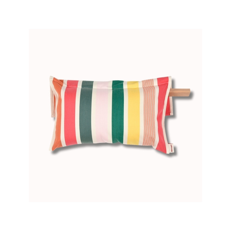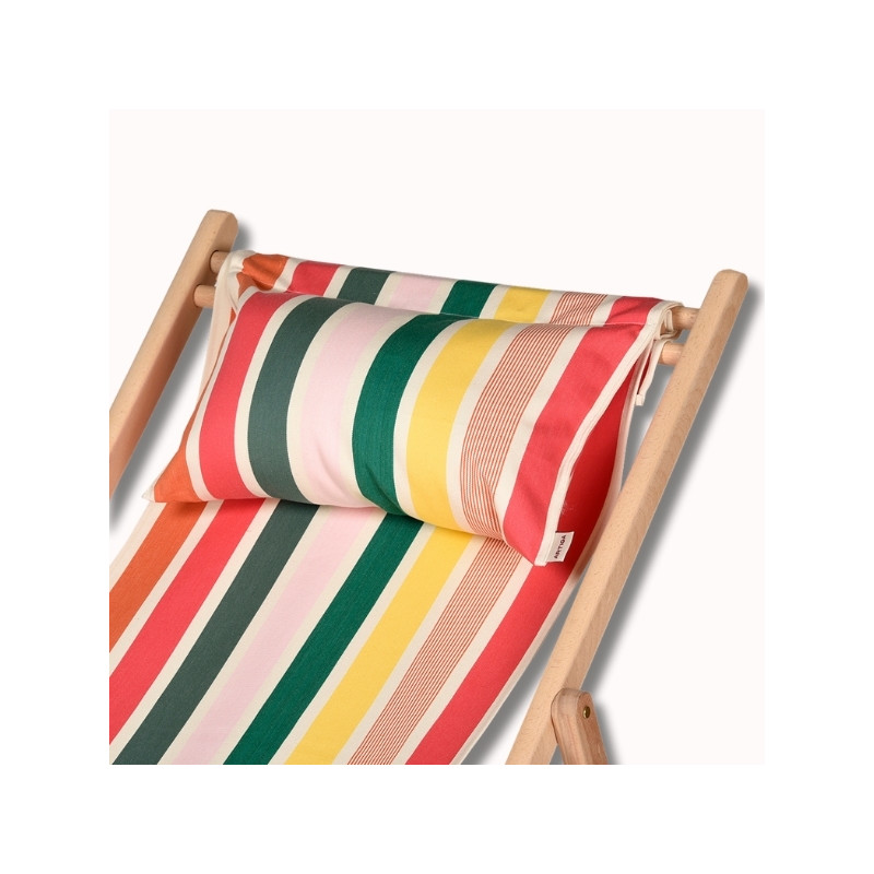 Ses rayures multicolores, aux nuances fruitées de melon, framboise, jaune doré, rose pâle et verts subtils, évoquent immédiatement les déjeuners à l’ombre, les siestes au jardin et les après-midis en plein air. Pensé pour s’adapter parfaitement aux chiliennes, ce paresseux peut également être utilisé comme coussin d’appoint sur une terrasse, un banc ou au sol.