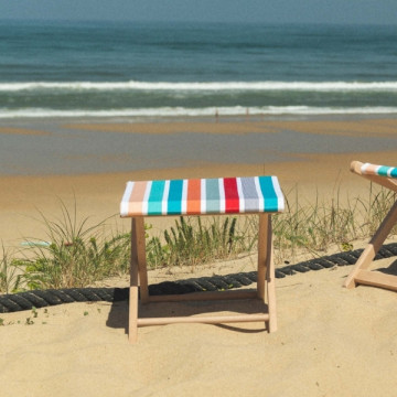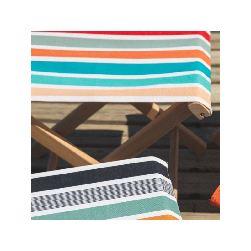 La toile prête à poser pour pliant pêche, 50 x 42 cm, finition ourlé de 5 cm et deux retours pour fixer les embouts en bois, est créée et imaginée par nos stylistes et tissée dans la vraie tradition des toiles basques.