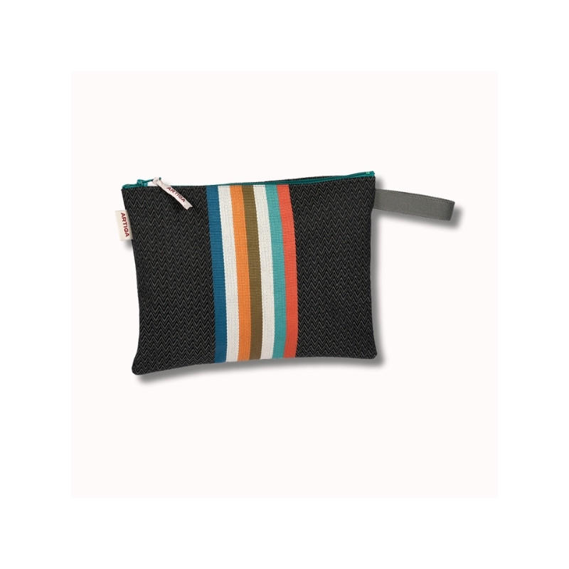 Réalisée en toile cirée, elle bénéficie d’un enduit intérieur inversé qui assure une protection efficace contre l’humidité et facilite l’entretien. Cette finition rend la pochette particulièrement adaptée aux usages estivaux et aux déplacements. Le motif Chevron noir se distingue par un tissage travaillé apportant relief et profondeur à la matière, pour un rendu à la fois sobre et graphique.