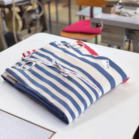 Le motif à rayures bleues et blanches évoque la fraîcheur méditerranéenne et s’adapte aussi bien à un intérieur moderne qu’à une décoration bord de mer. Ces rideaux hors collection, disponibles en quantité limitée, sont proposés à un tarif spécial pour donner un avenir au travail déjà accompli.