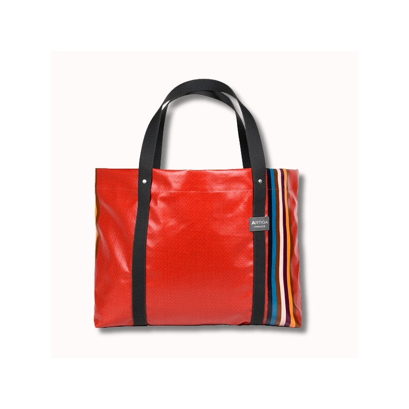 Le sac shopping Charly chevron brique séduit par sa toile cirée imperméable au fini brillant et sa couleur chaleureuse relevée de rayures multicolores.