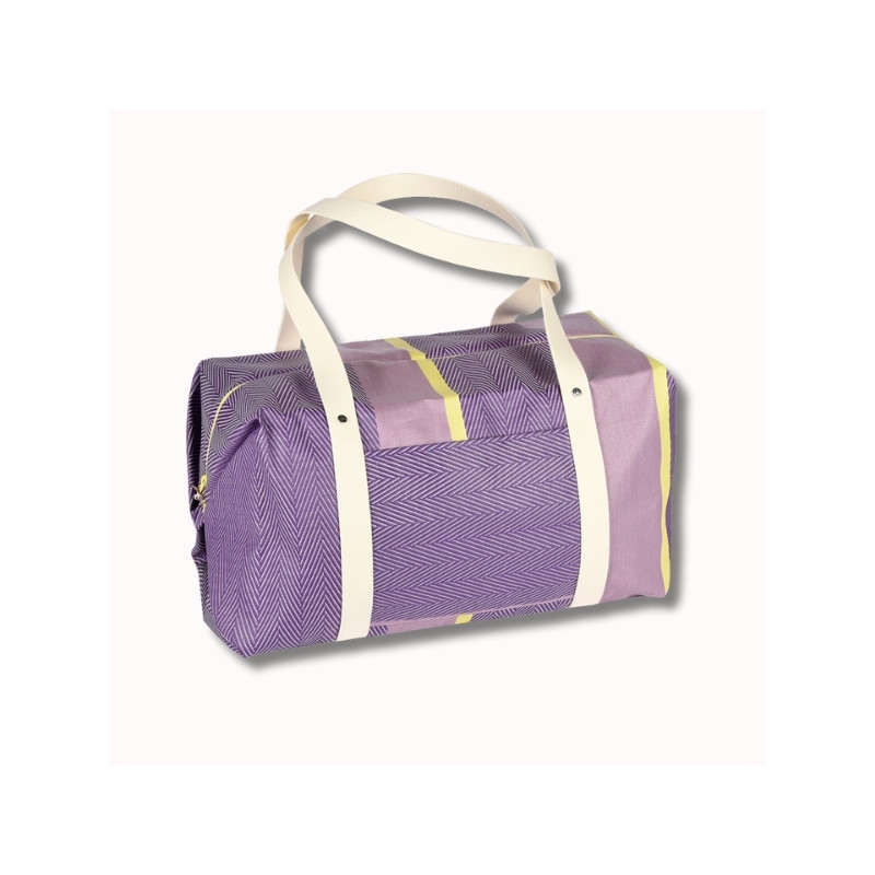 Réalisé à partir de notre toile 100% coton ayant subi un traitement ciré, ce sac se distingue par son aspect toile cirée élégant et sa grande praticité. Cette finition protège le contenu contre l’humidité et facilite l’entretien, un simple coup d’éponge suffisant pour le nettoyer. Le motif Chevron XL, issu d’un tissage travaillé mêlant chevron et bande reps, apporte relief et caractère à la matière, tandis que le coloris parme donne au sac un esprit moderne, tendance et estival.
