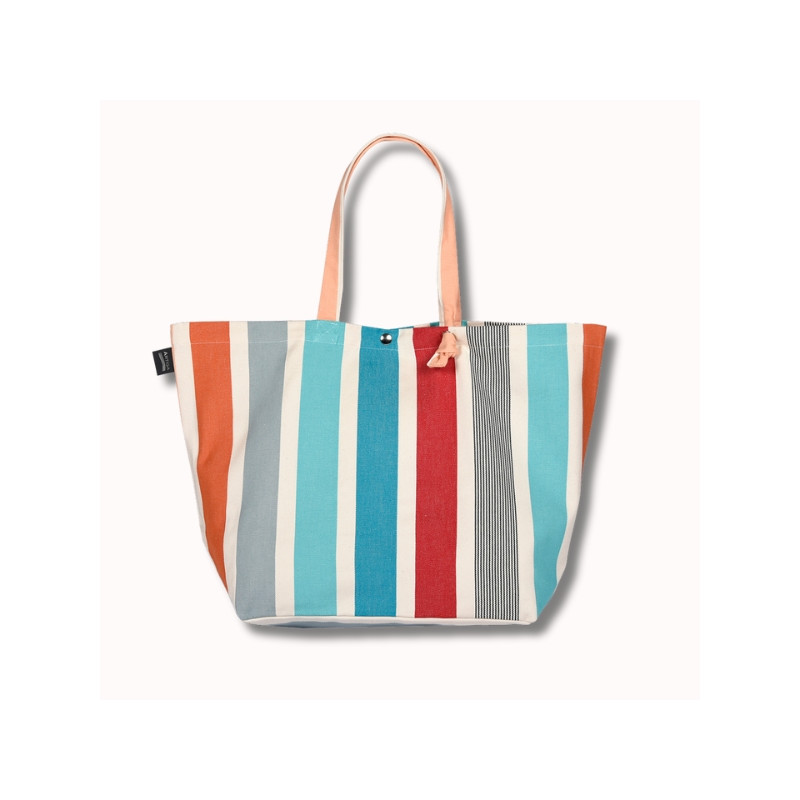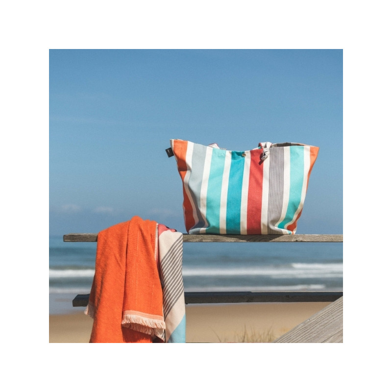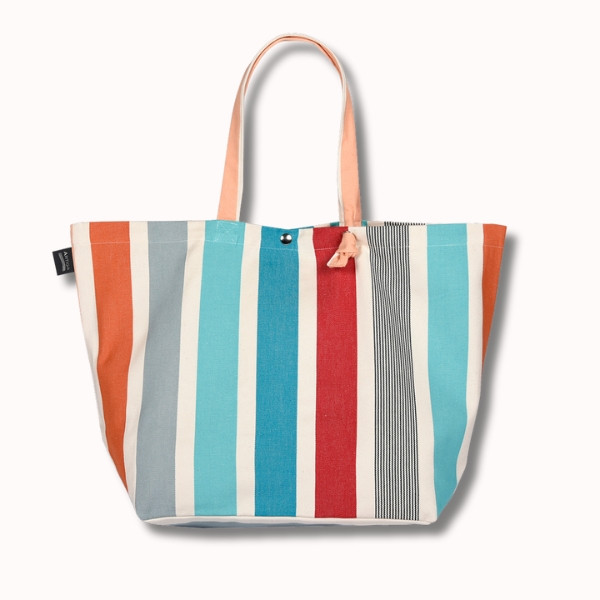 Fabriqué en coton biologique dans notre atelier du Sud-Ouest; dans les Landes, à Magescq; il associe un design rayé aux teintes estivales pêche, rouge et bleu, pour un style frais et ensoleillé.