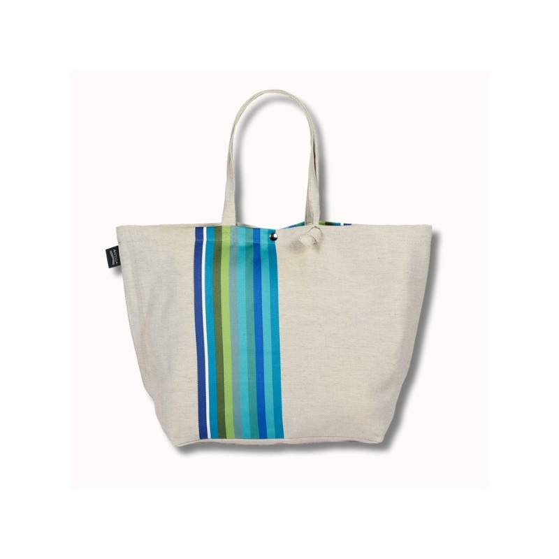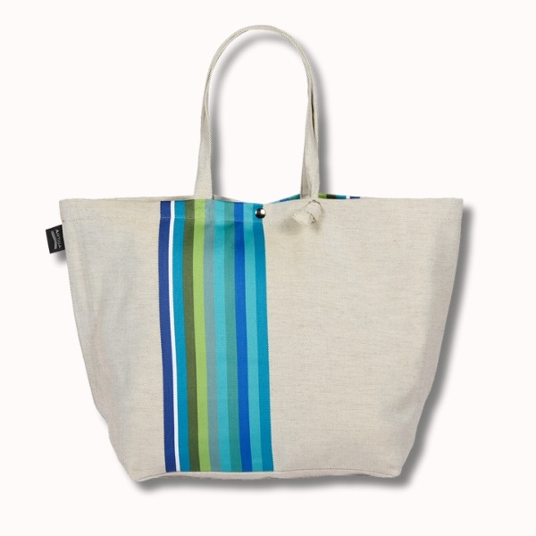 Un sac éclatant aux rayures turquoise, bleu azur et vert anis.