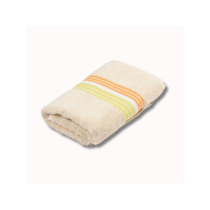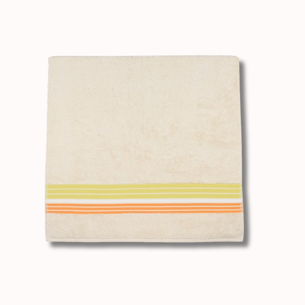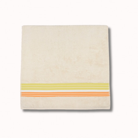 Notre serviette est en tissu naturel 100% coton. Elle est de couleur écru avec des rayures citron.
