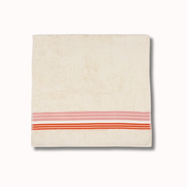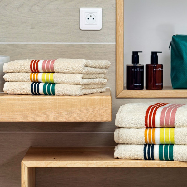 Notre serviette est en tissu naturel 100% coton. Elle est de couleur écru avec des rayures oeillet.