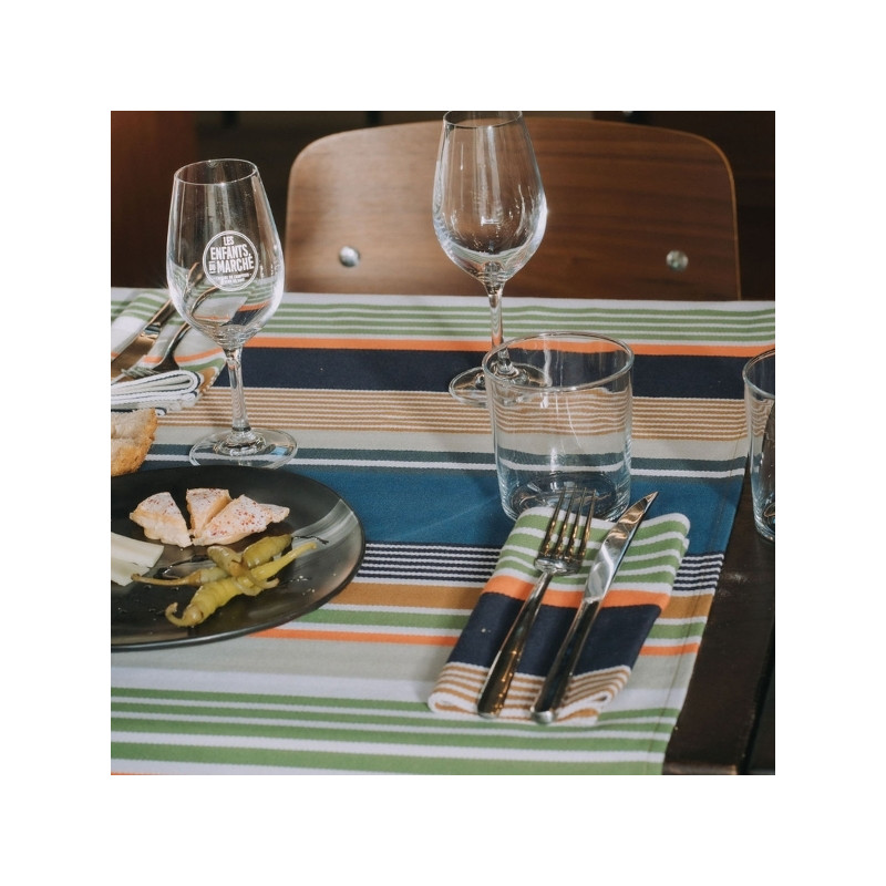 Réalisée en 100% coton, elle met en valeur la singulière cadence de rayures de la toile Argelos, qui marie avec équilibre tons froids et touches vives.
